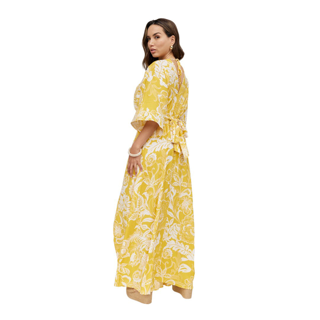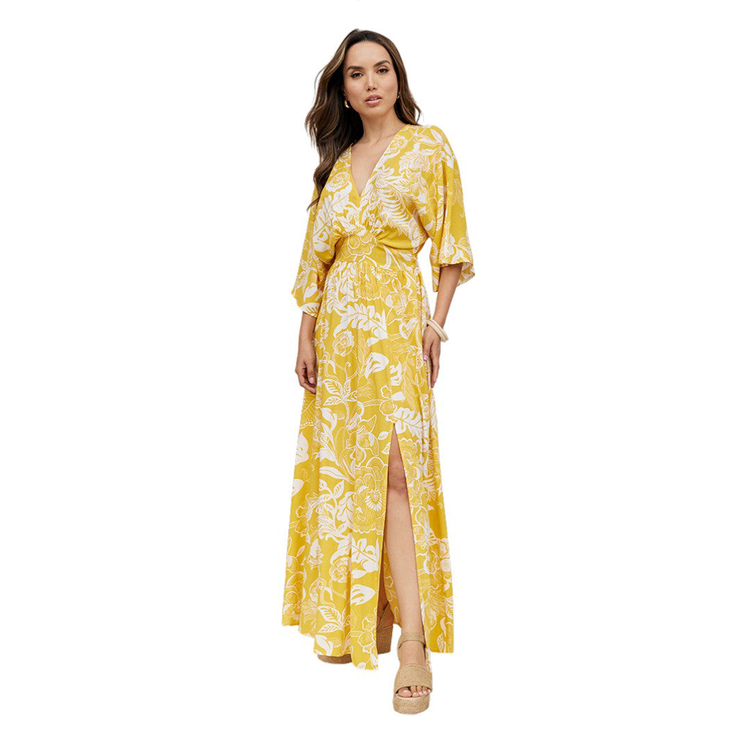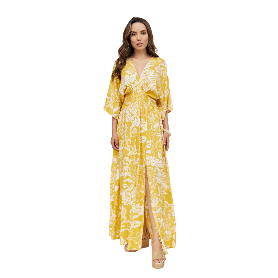 Vestido largo para dama en viscosa. Diseño estampado floral con escote en V, manga media y abertura lateral. Color amarillo multicolor. Estilo casual femenino. Ideal para salidas. Ofrece comodidad y versatilidad.