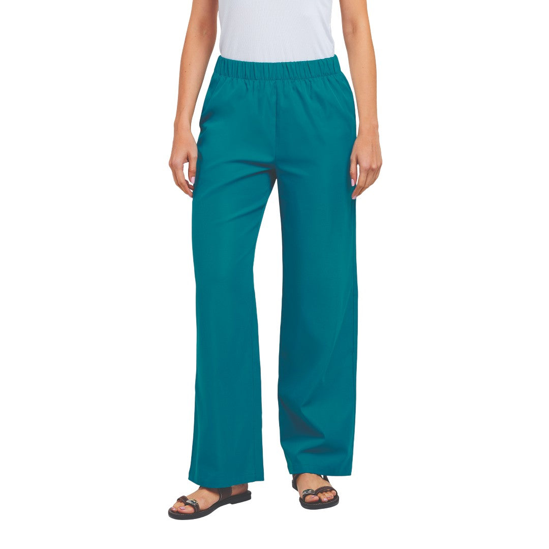 - Pantalón verde turquesa con cintura elástica, bolsillos frontales y corte recto amplio