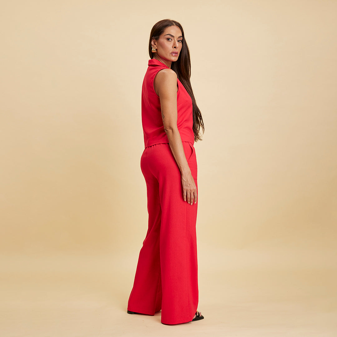 - Chaleco rojo con escote en “V”, cuello camisero y cierre metálico frontal.