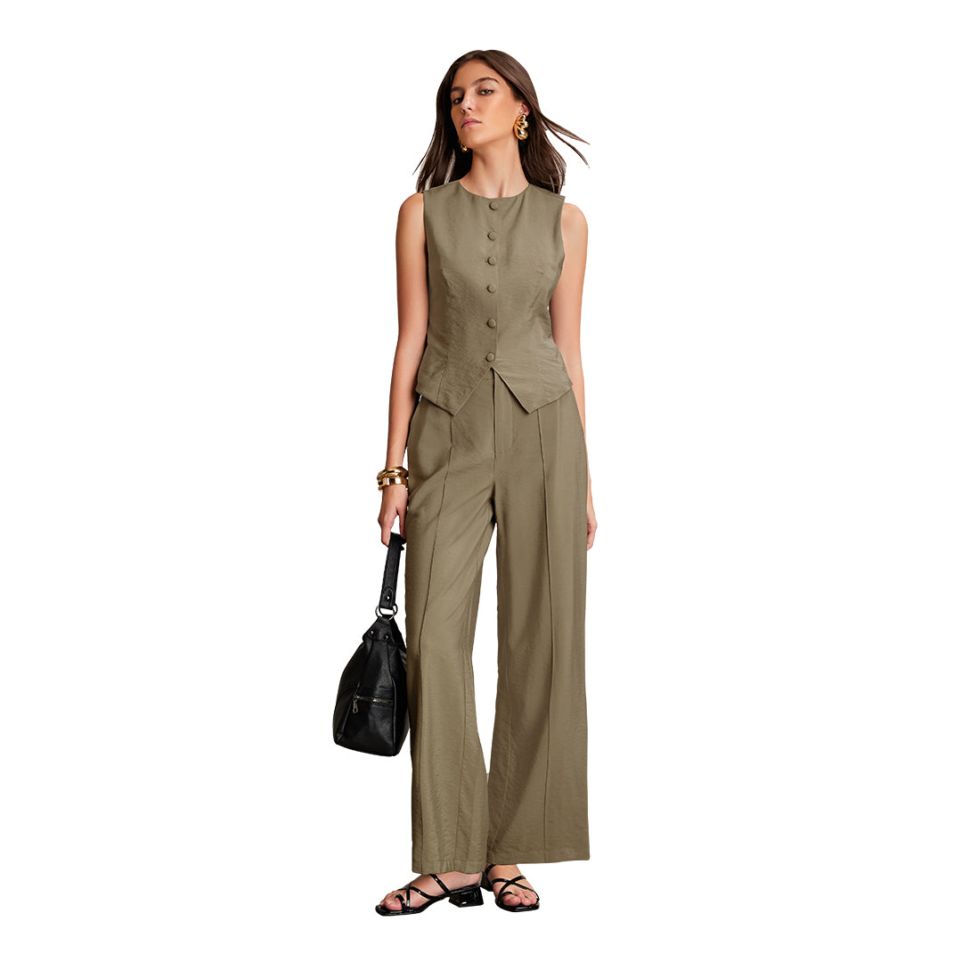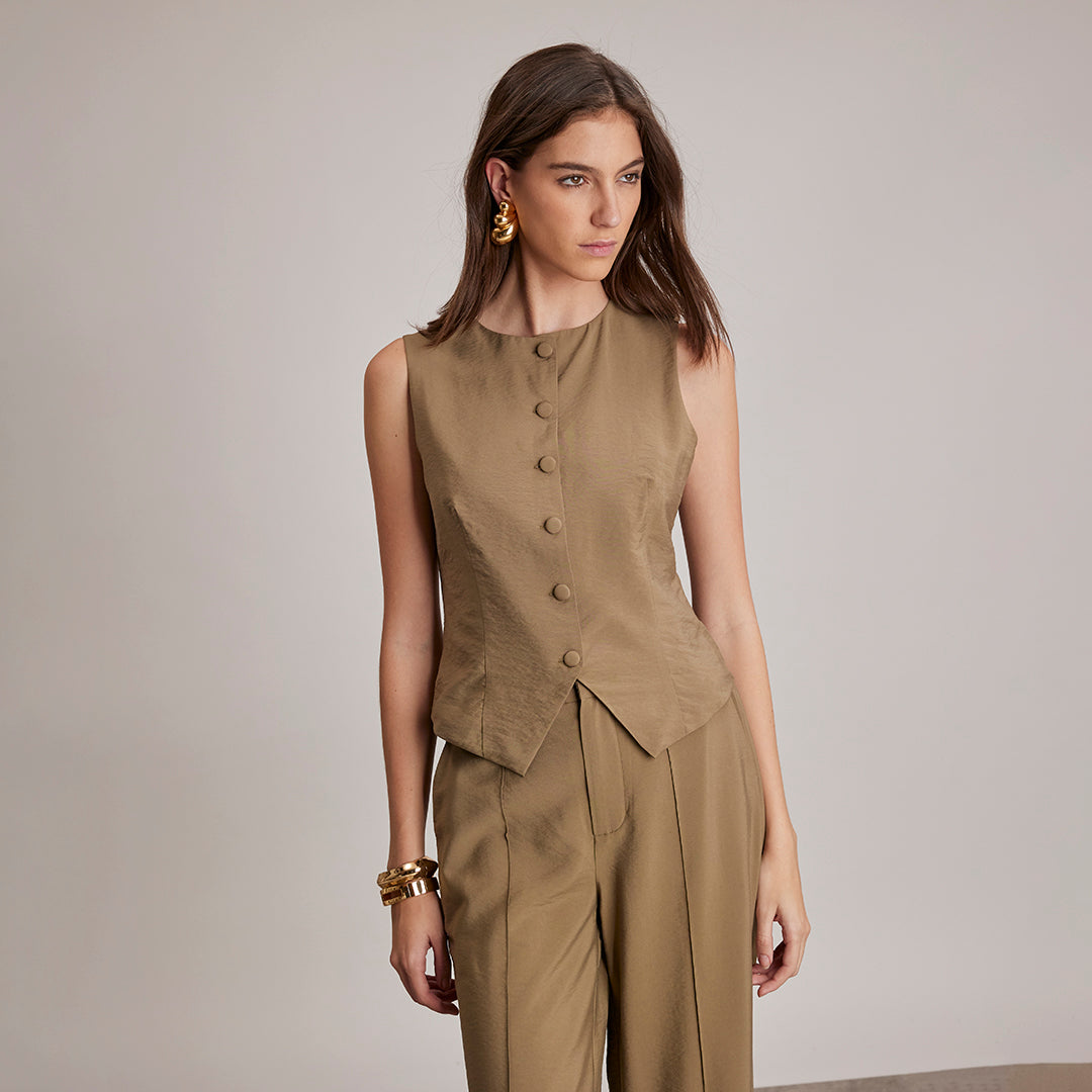 - Chaleco verde ajustado al cuerpo, sin mangas, cuello redondo y botones forrados