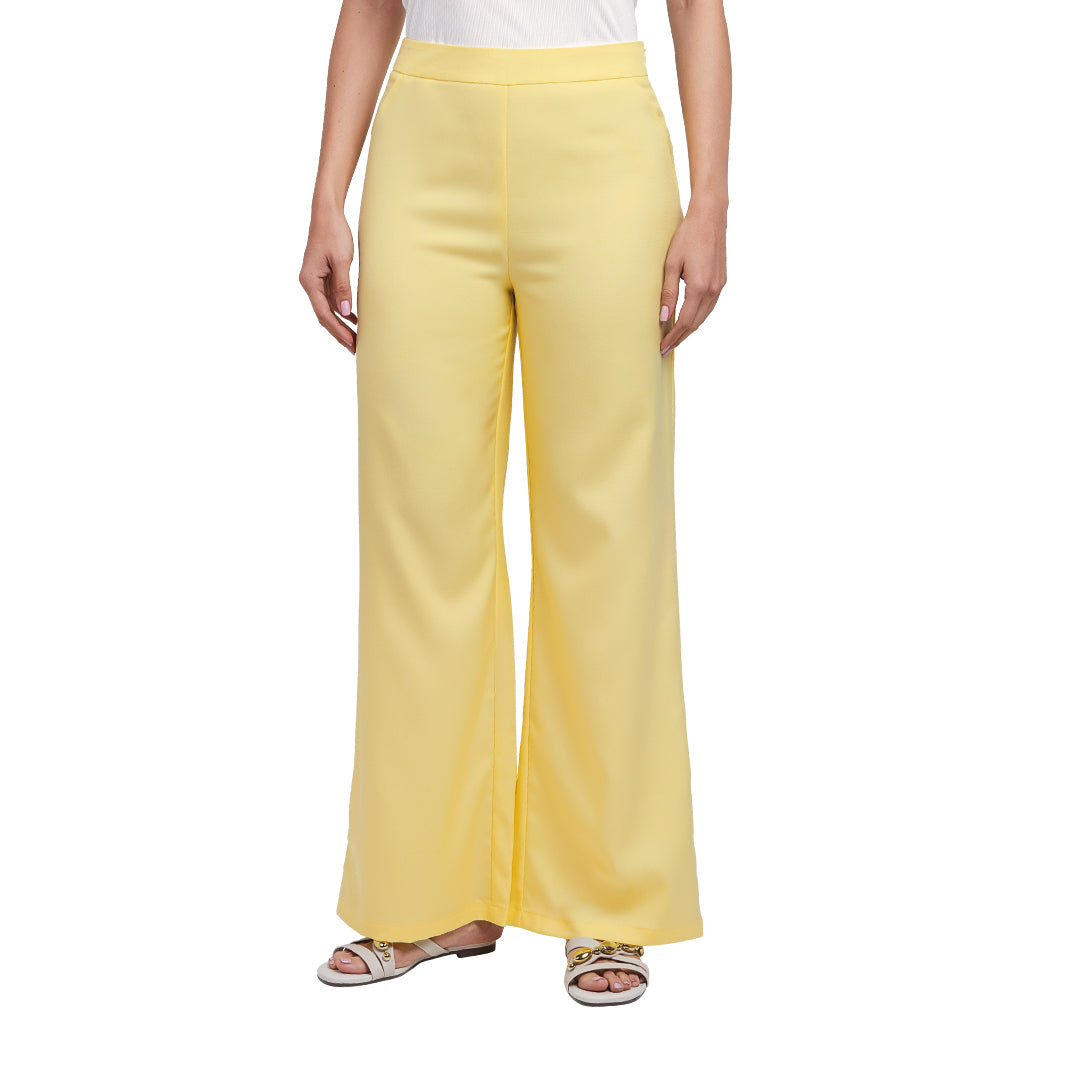 - Pantalón amarillo mantequilla de corte recto y pierna ligeramente ancha, con bolsillos frontales y pinzas traseras.