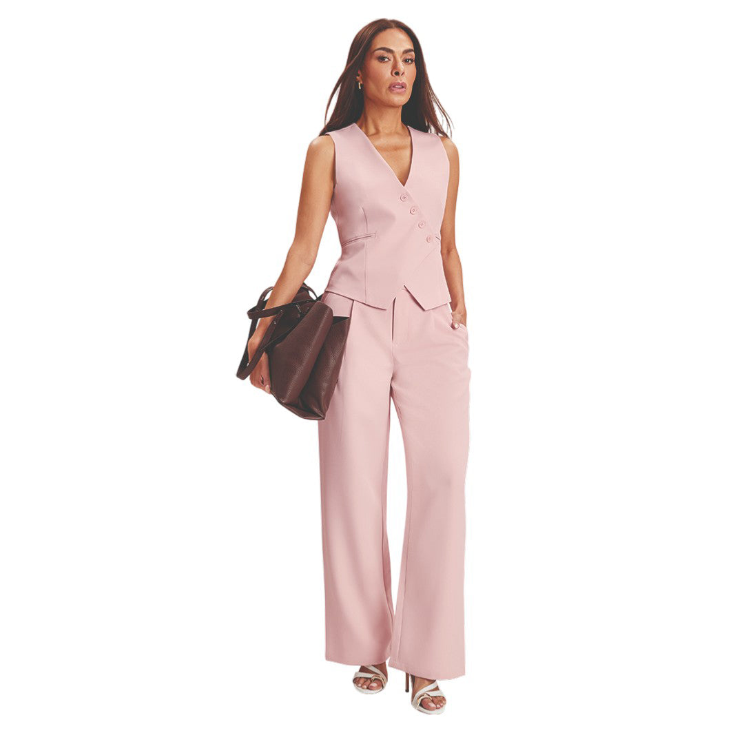 - Chaleco rosa palo cruzado con escote “V”, botón interno y vivos decorativos en cintura; forrado.