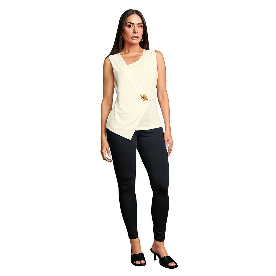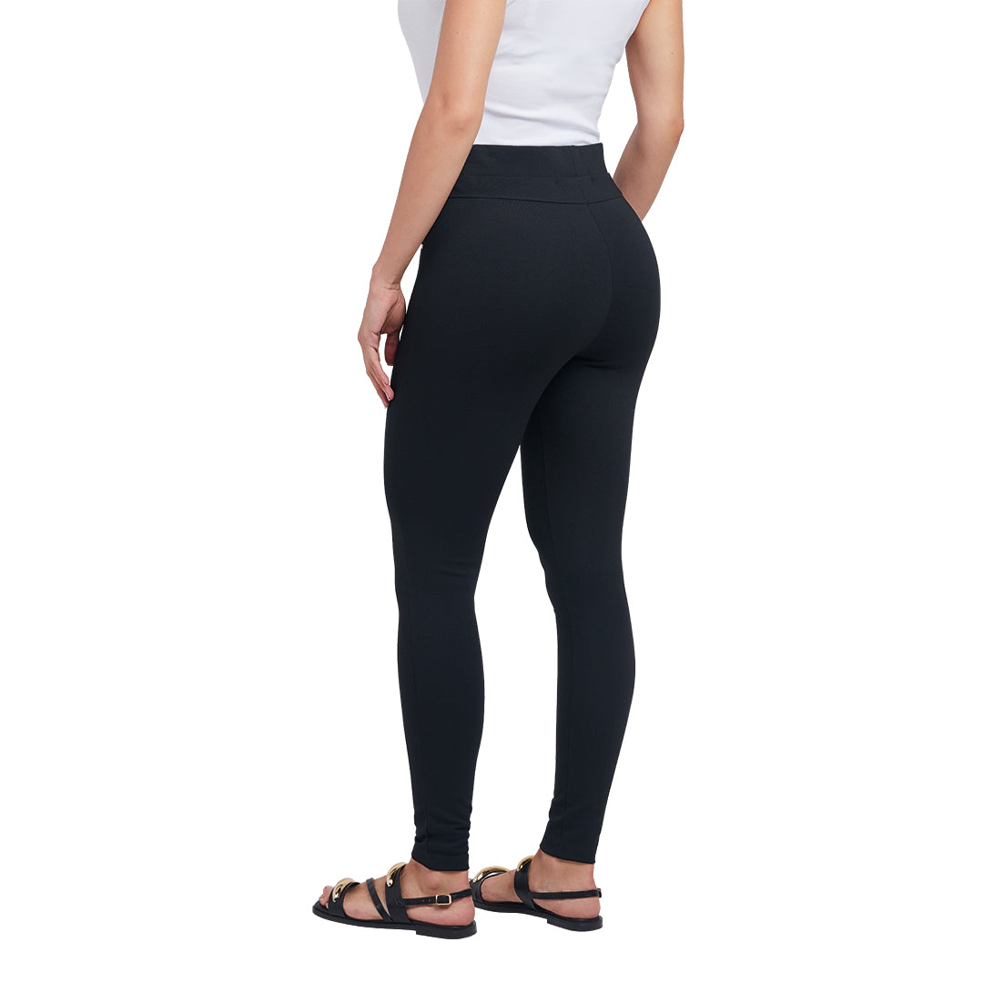 Jeggins negro con cintura elástica, cortes decorativos y remaches dorados; ajuste cómodo y moderno ideal para looks casuales y urbanos.
