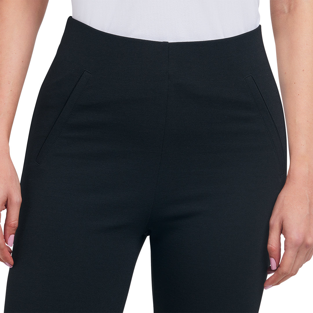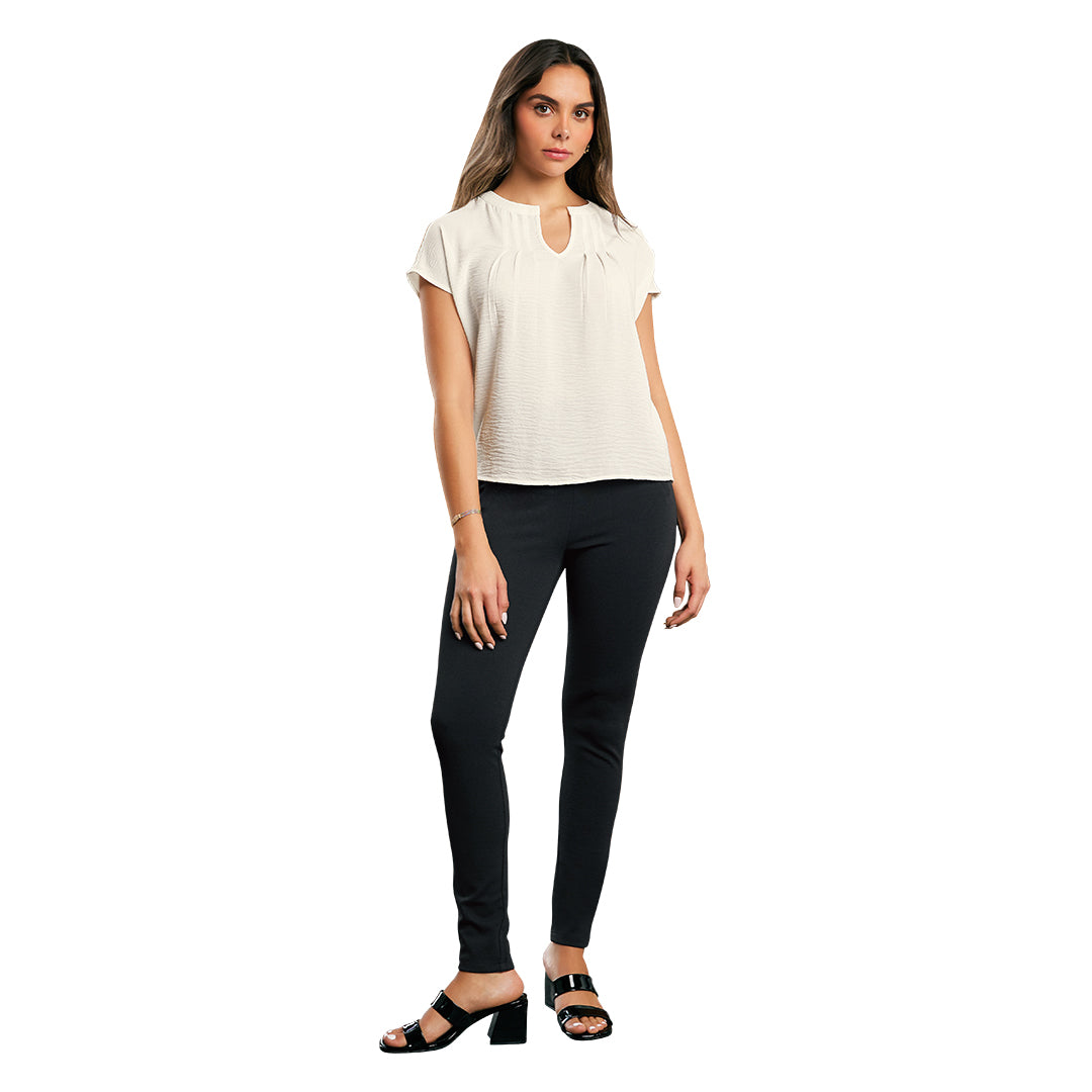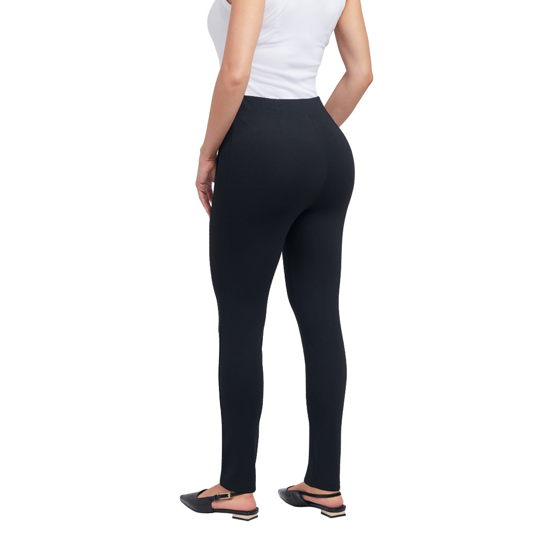 Leggins negros con cintura elástica, corte ajustado y vivos decorativos en cadera; cómodos, modernos y perfectos para outfits deportivos o casuales.