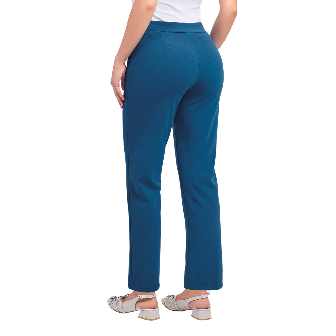 Pantalón azul con cintura elástica, costuras decorativas y corte ajustado tobillero; moderno, cómodo y perfecto para uso diario.