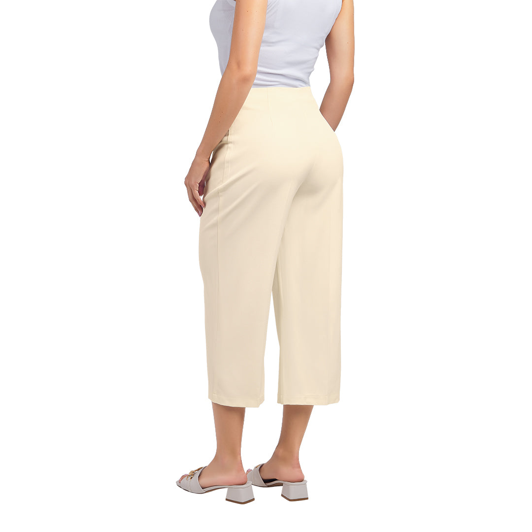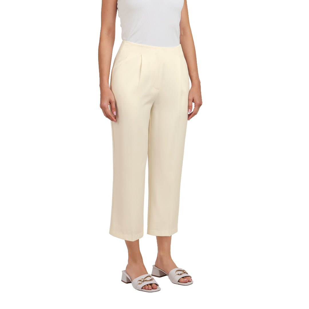 Pantalón ivory recto de largo capri con gancho metálico, pinzas decorativas, bolsillos frontales y doblez marcado en pierna; limpio, elegante y perfecto para looks modernos de oficina o uso diario.