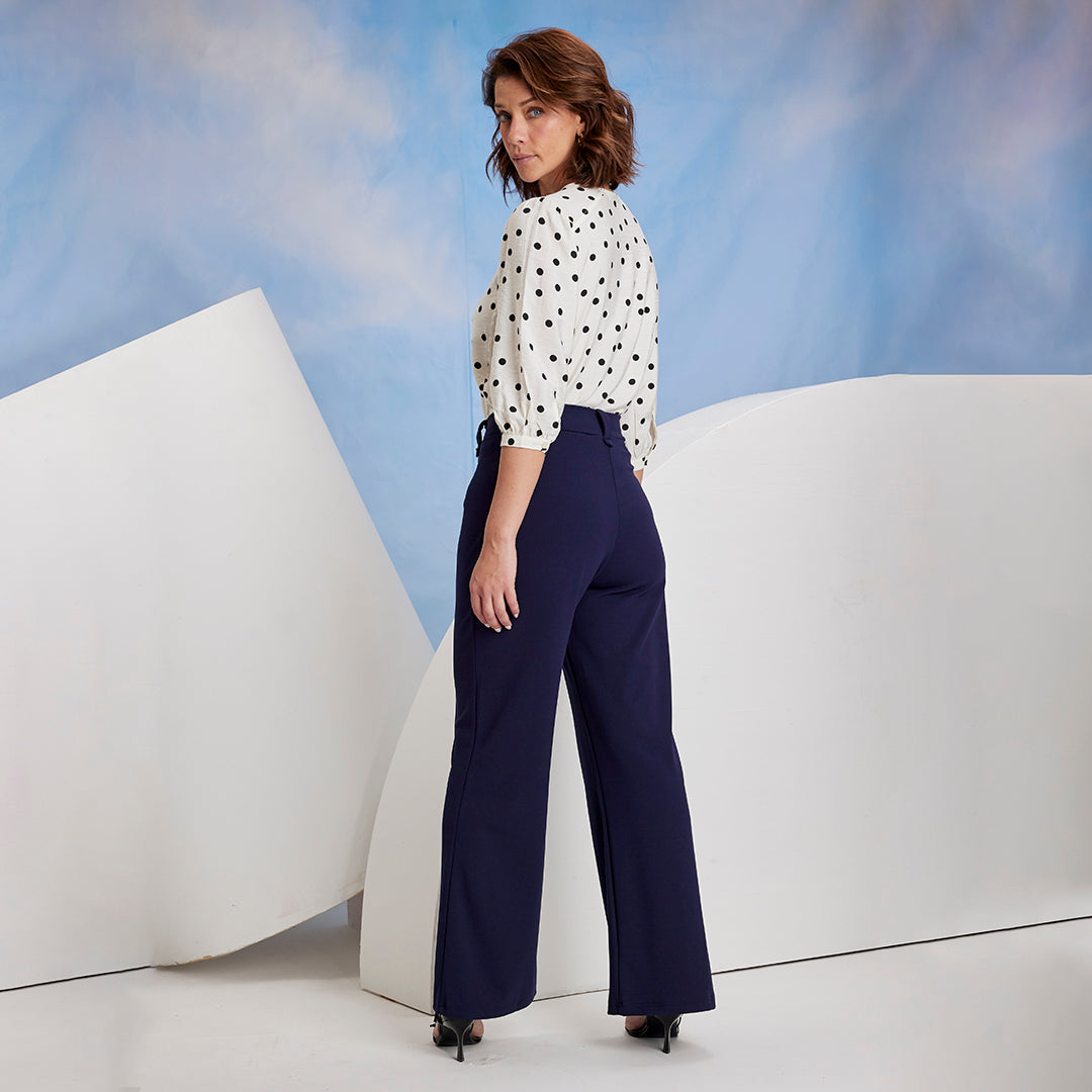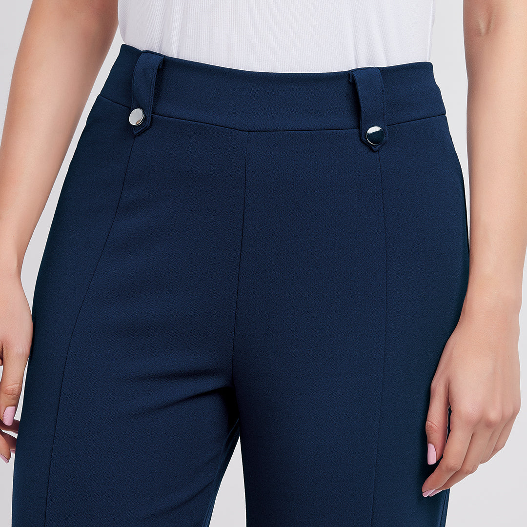 Pantalón marino con pretina elástica, presillas con remaches metálicos y corte pata ancha; cómodo, moderno y perfecto para looks formales o casuales.