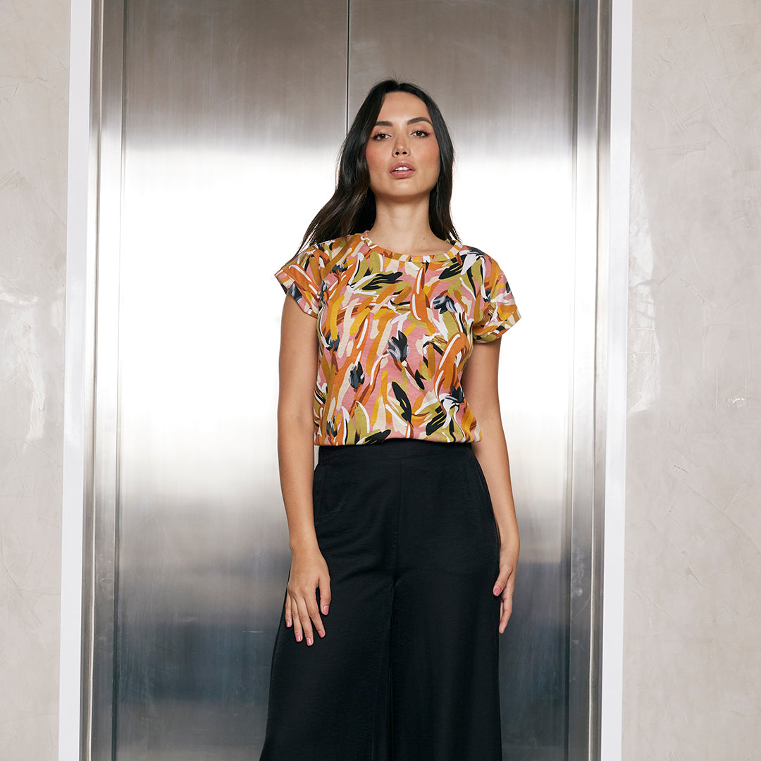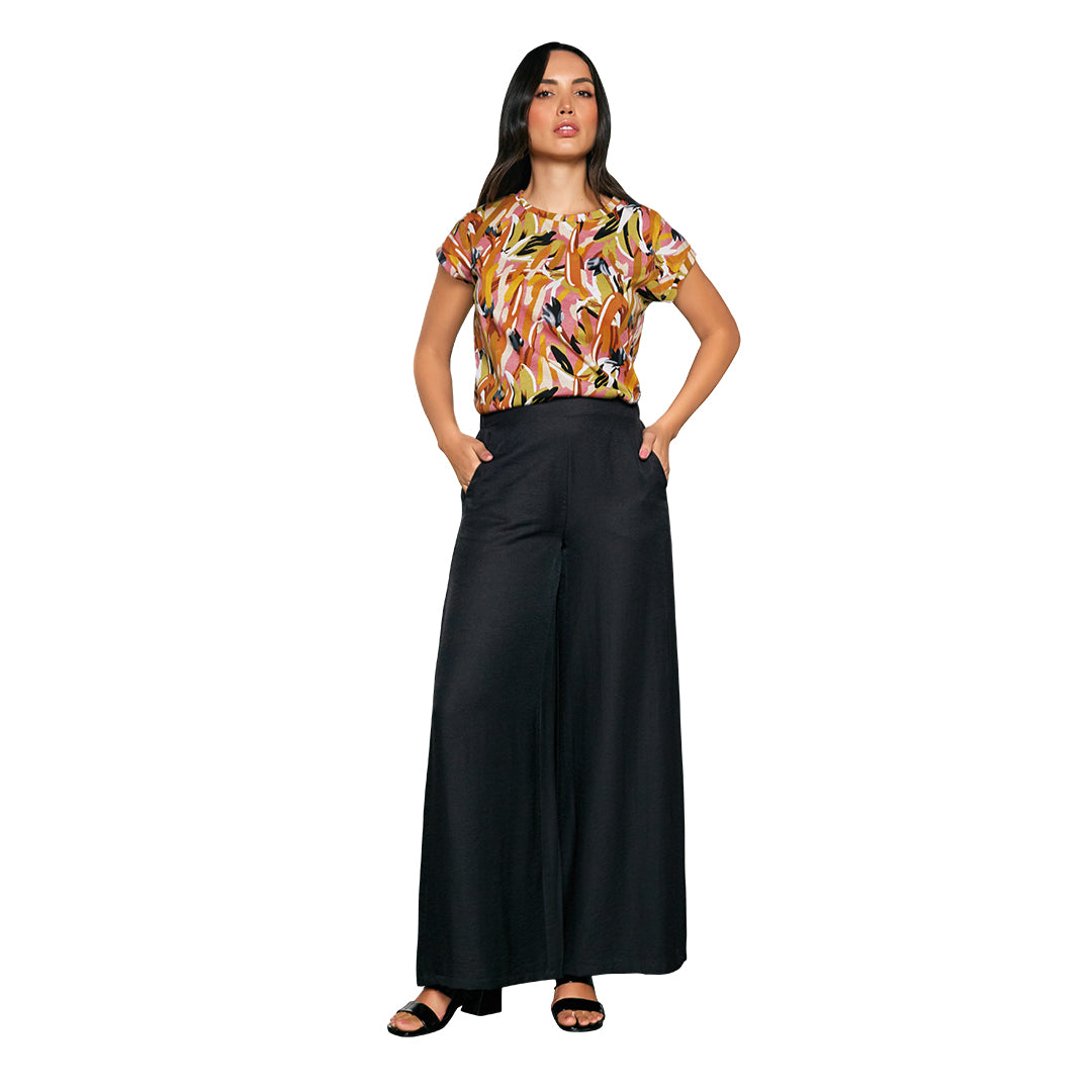 Pantalón negro para mujer con pretina plana al frente y elástica en la parte trasera que brinda ajuste cómodo. Su corte recto de pata ancha y tela de tacto suave lo hacen ideal para estilizar la silueta con elegancia y confort durante todo el día.