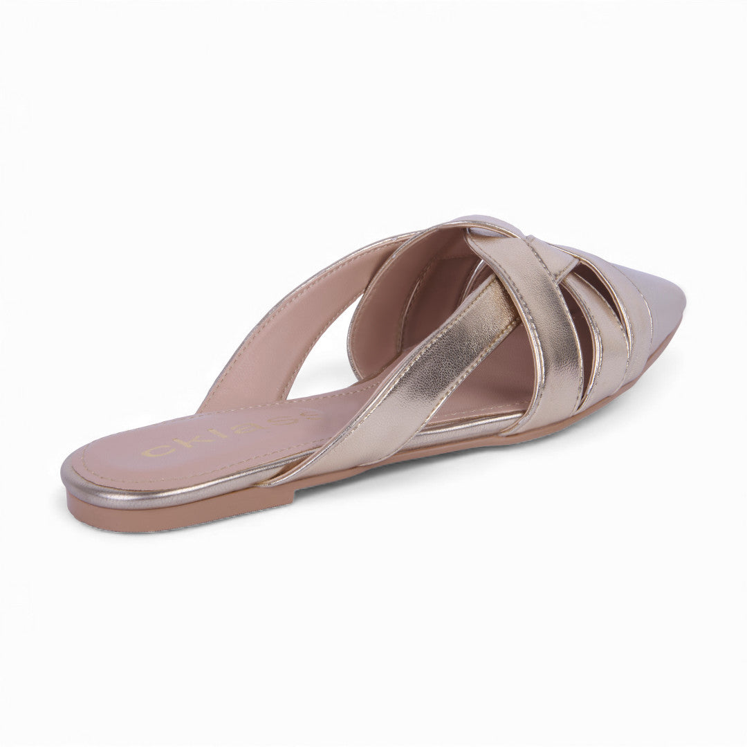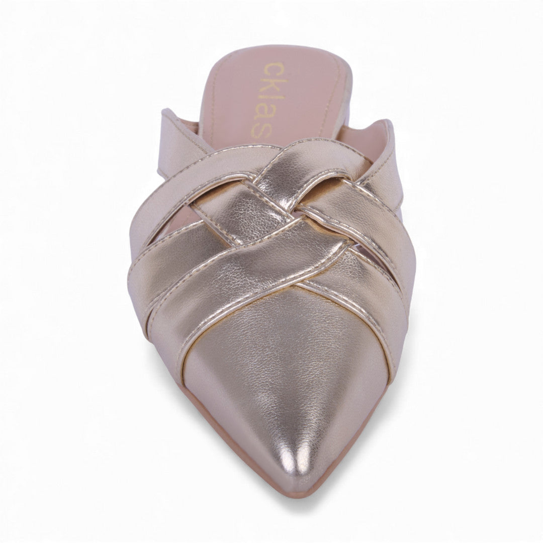 Sueco de piso color oro con tiras entretejidas y acabado metálico brillante. Con plantilla sintética acolchada que brinda comodidad y suela flexible para un paso ligero. Diseño moderno y versátil, perfecto para complementar atuendos casuales o elegantes con un toque sofisticado.