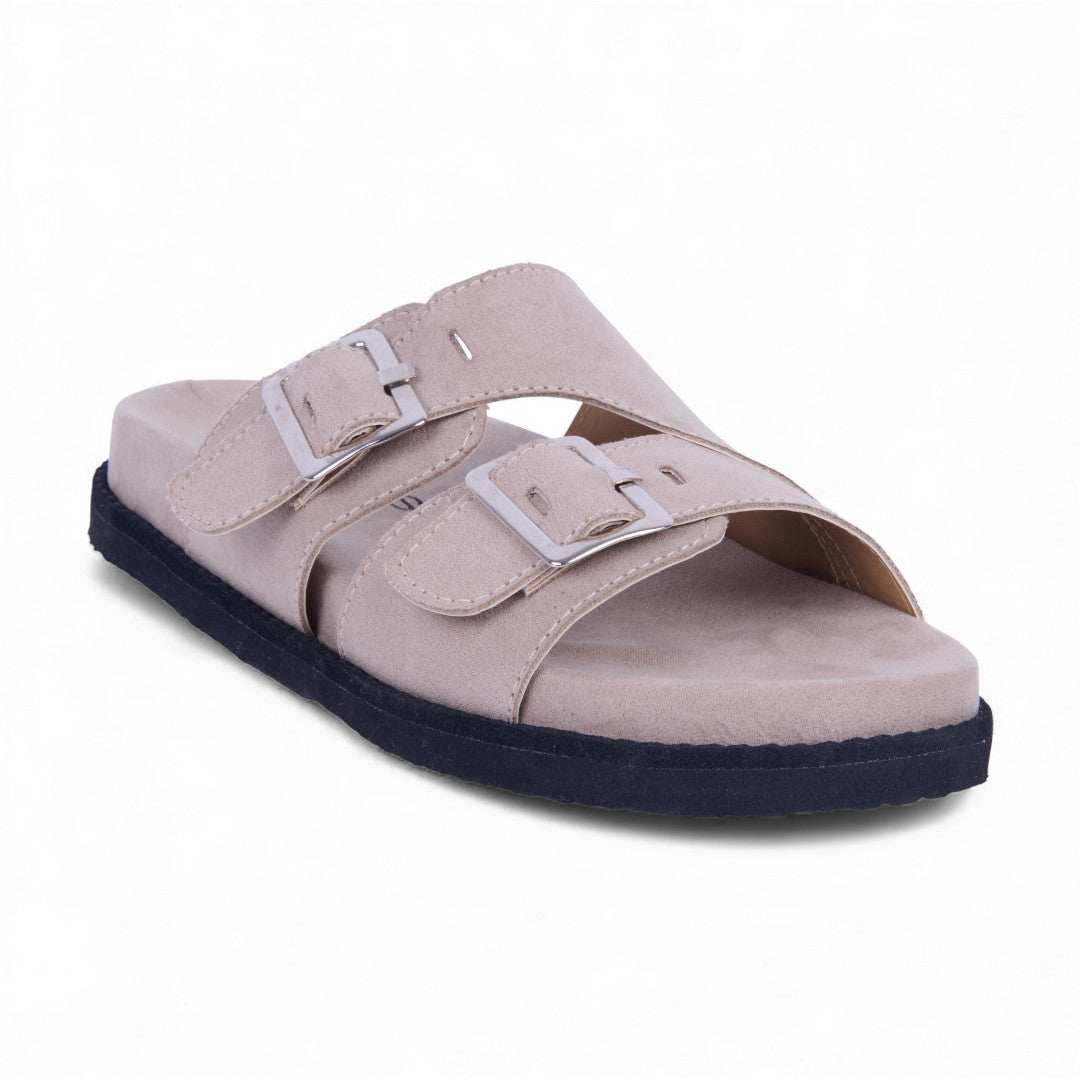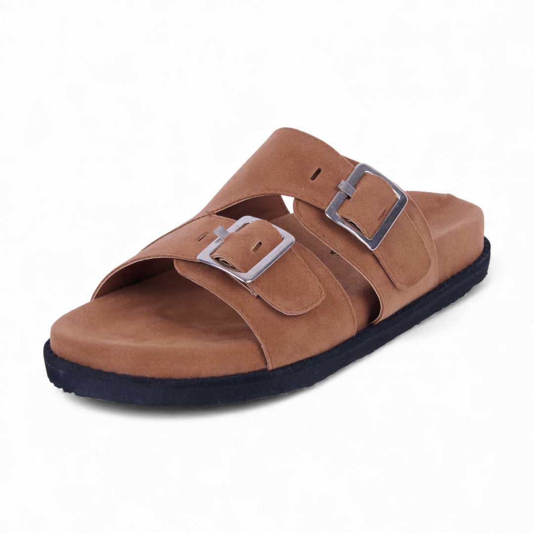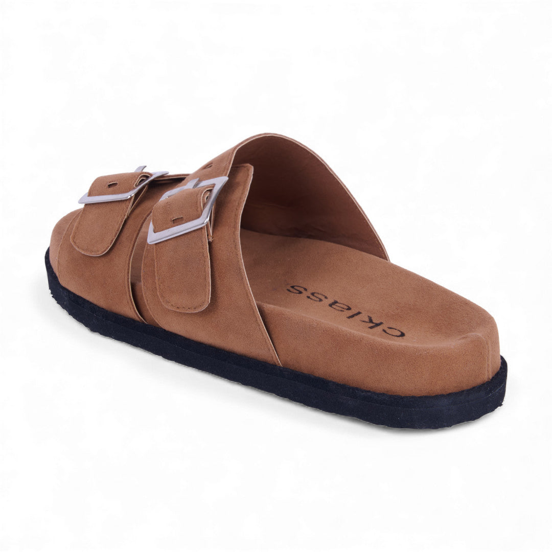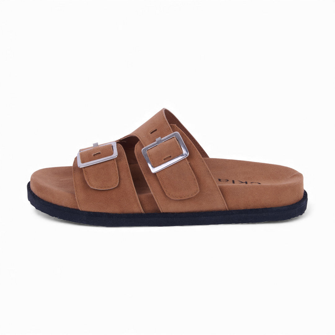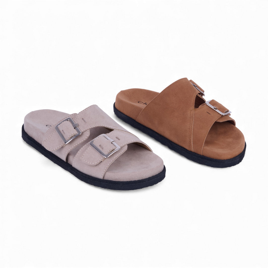 Dúo de sandalias de piso tipo Birkenstock con látigos ajustables y hebilla metálica, acabado tipo gamuza que aporta estilo y sofisticación. Plantilla sintética acolchada para máxima comodidad. Colores café y beige versátiles. Perfectas para looks casuales y urbanos diarios.
