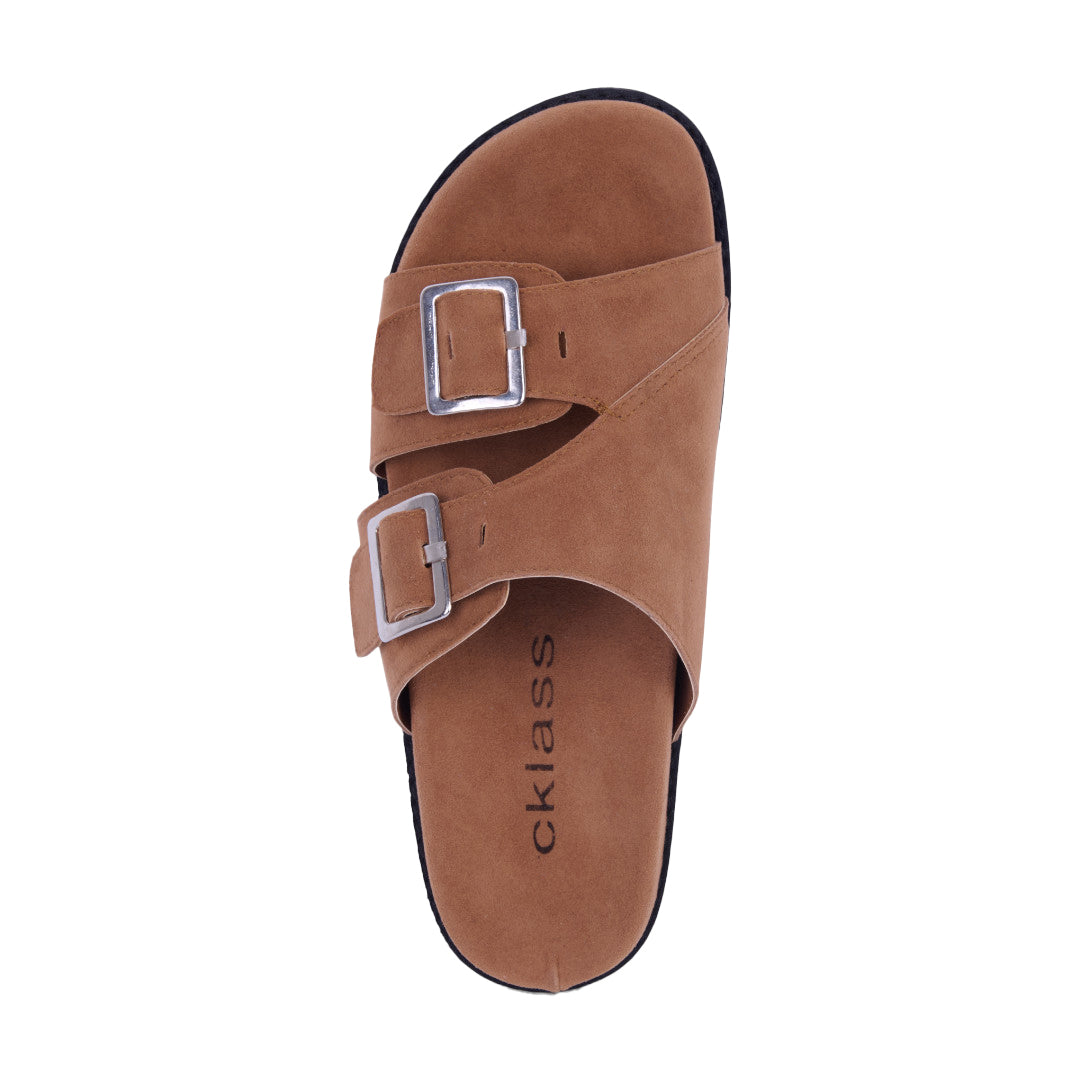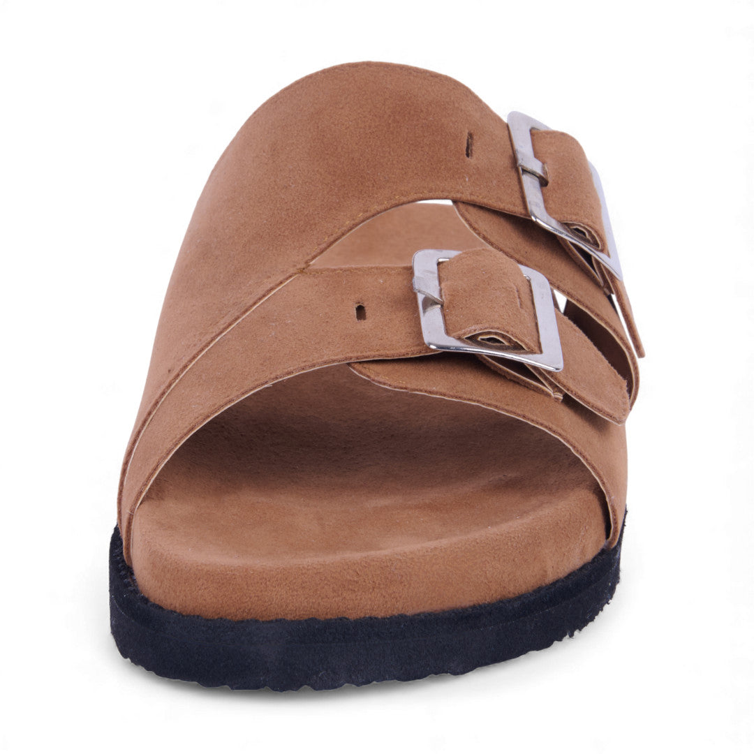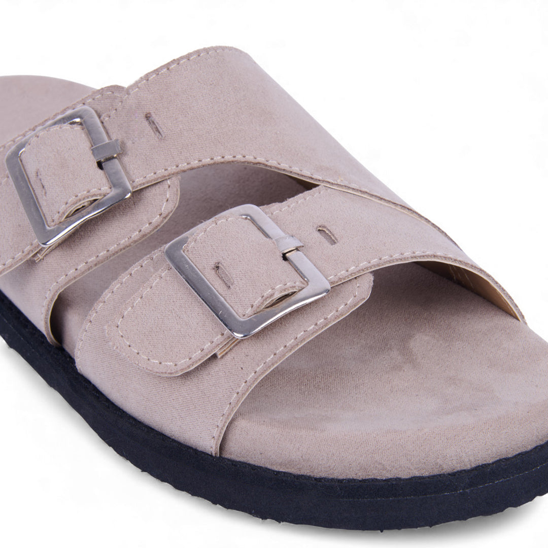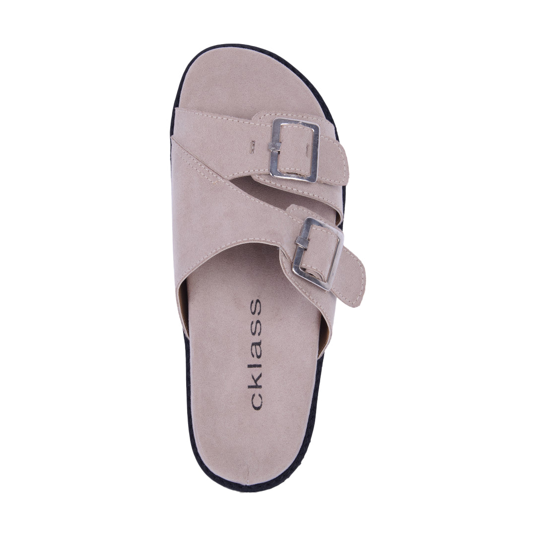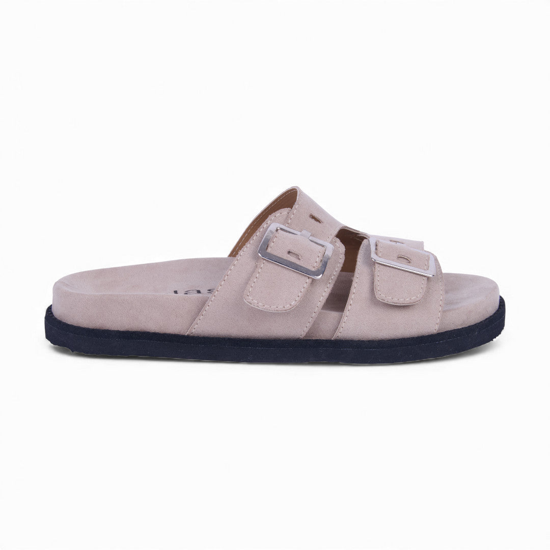 Dúo de sandalias de piso tipo Birkenstock con látigos ajustables y hebilla metálica, acabado tipo gamuza que aporta estilo y sofisticación. Plantilla sintética acolchada para máxima comodidad. Colores café y beige versátiles. Perfectas para looks casuales y urbanos diarios.