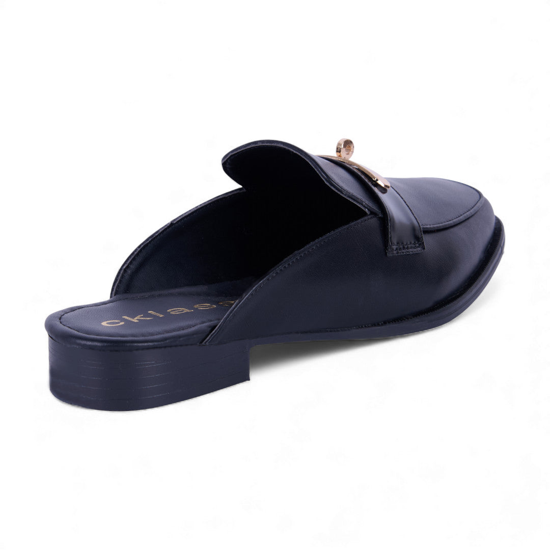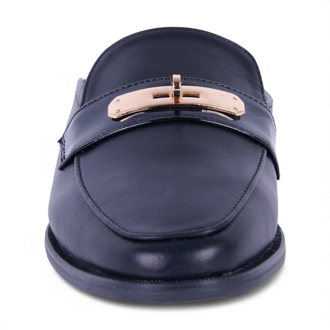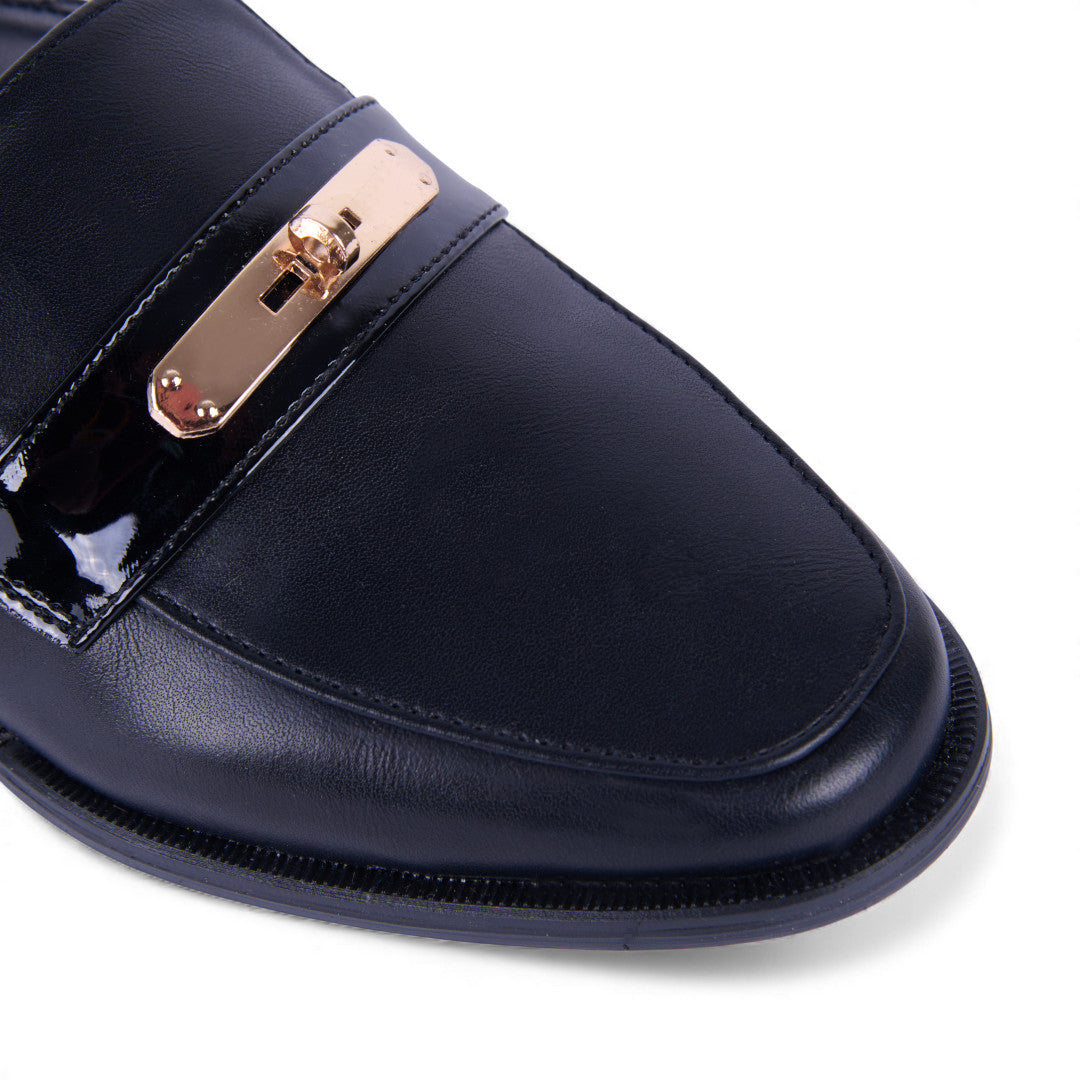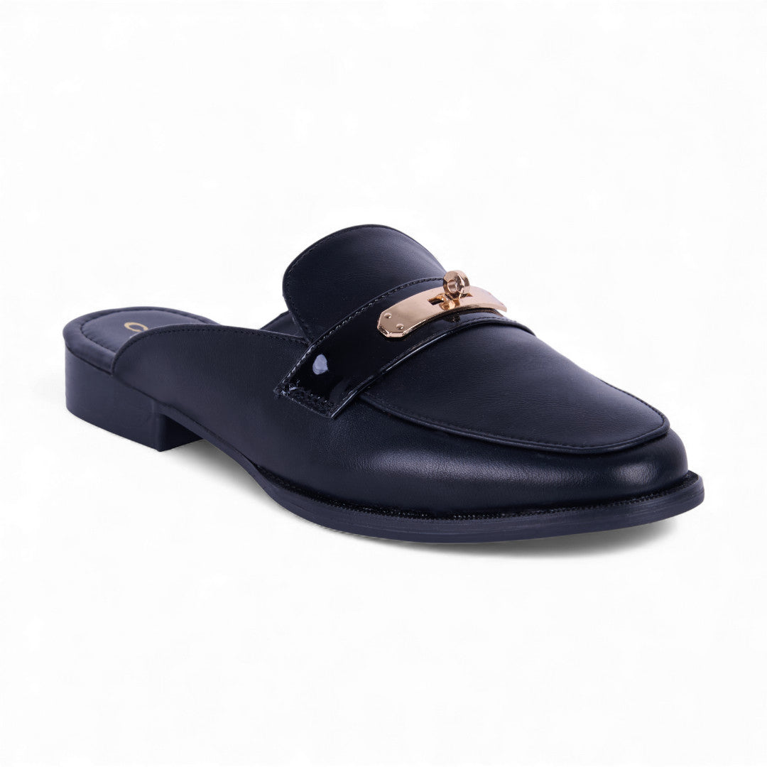 Mocasín de piso color negro con elásticos laterales, punta redondeada, forro interior suave y plantilla acolchada porcina; cómodo, flexible y perfecto para uso diario.