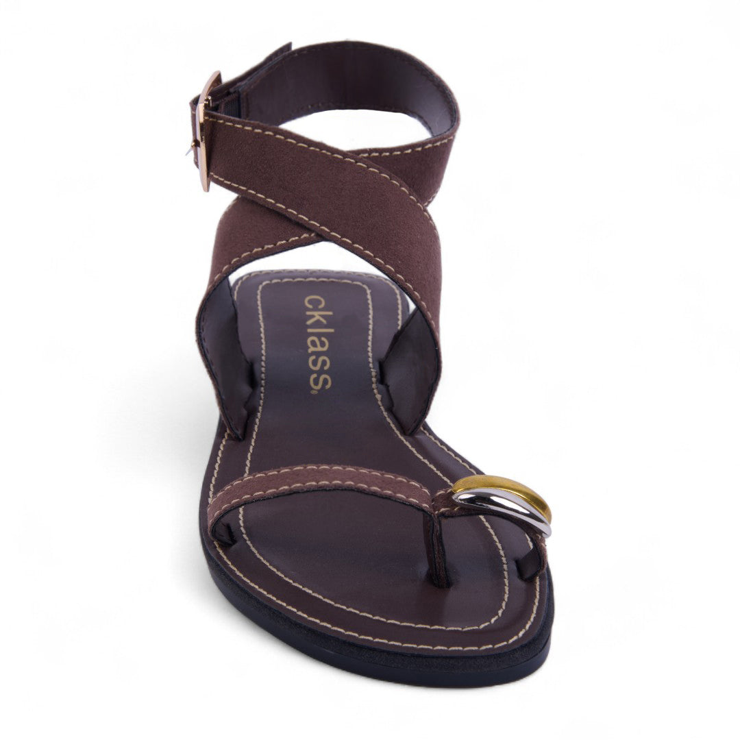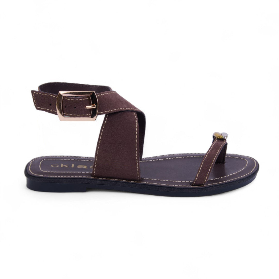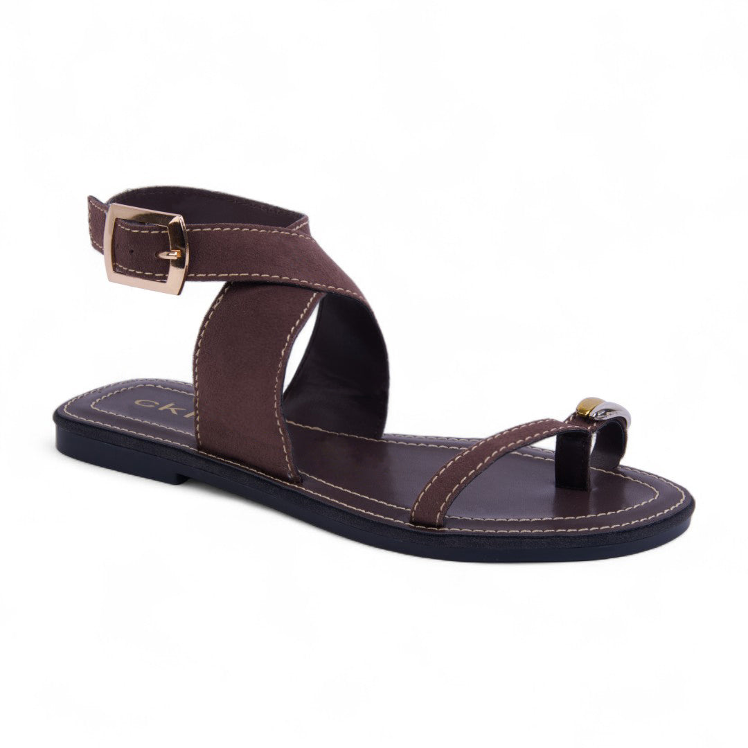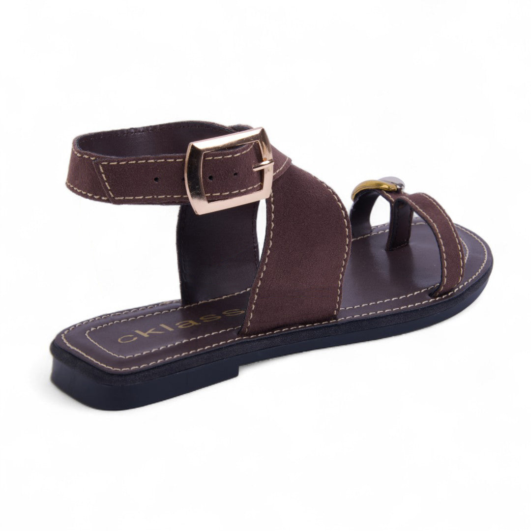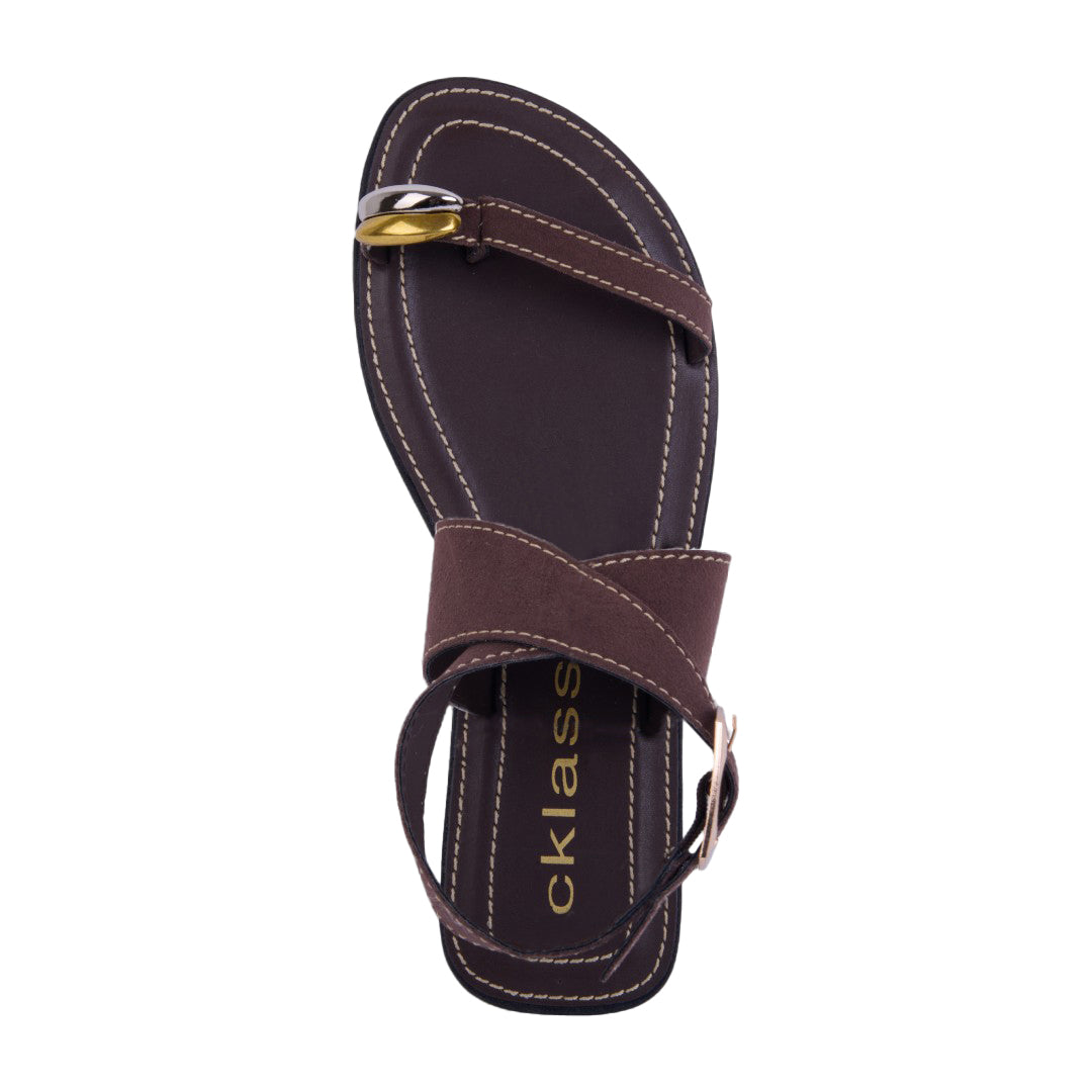 Sandalia de piso color café con herraje dorado decorativo y pulsera ajustable. Plantilla sintética cómoda y diseño moderno ideal para uso diario.