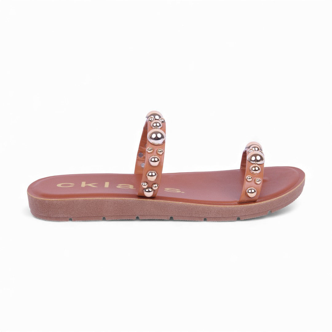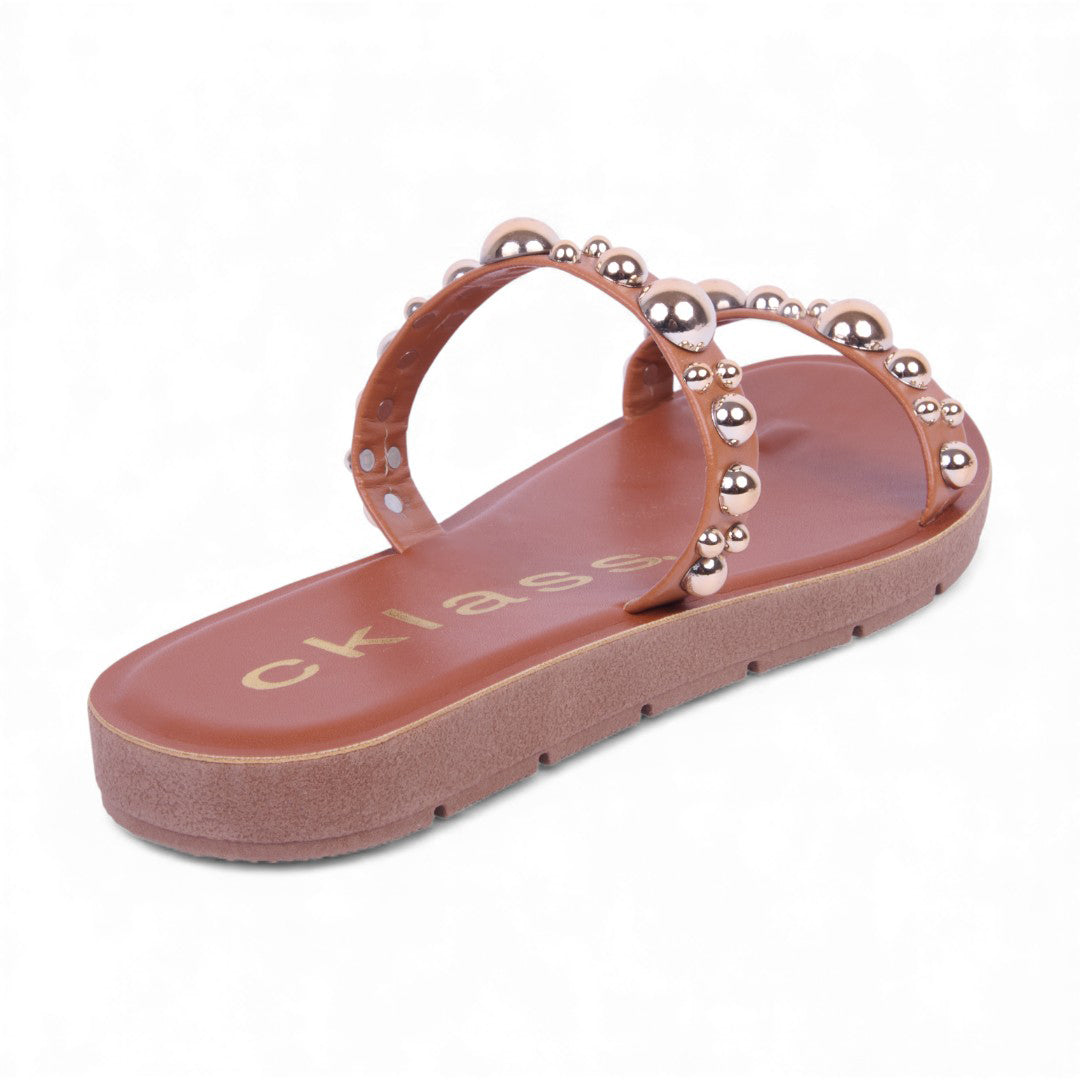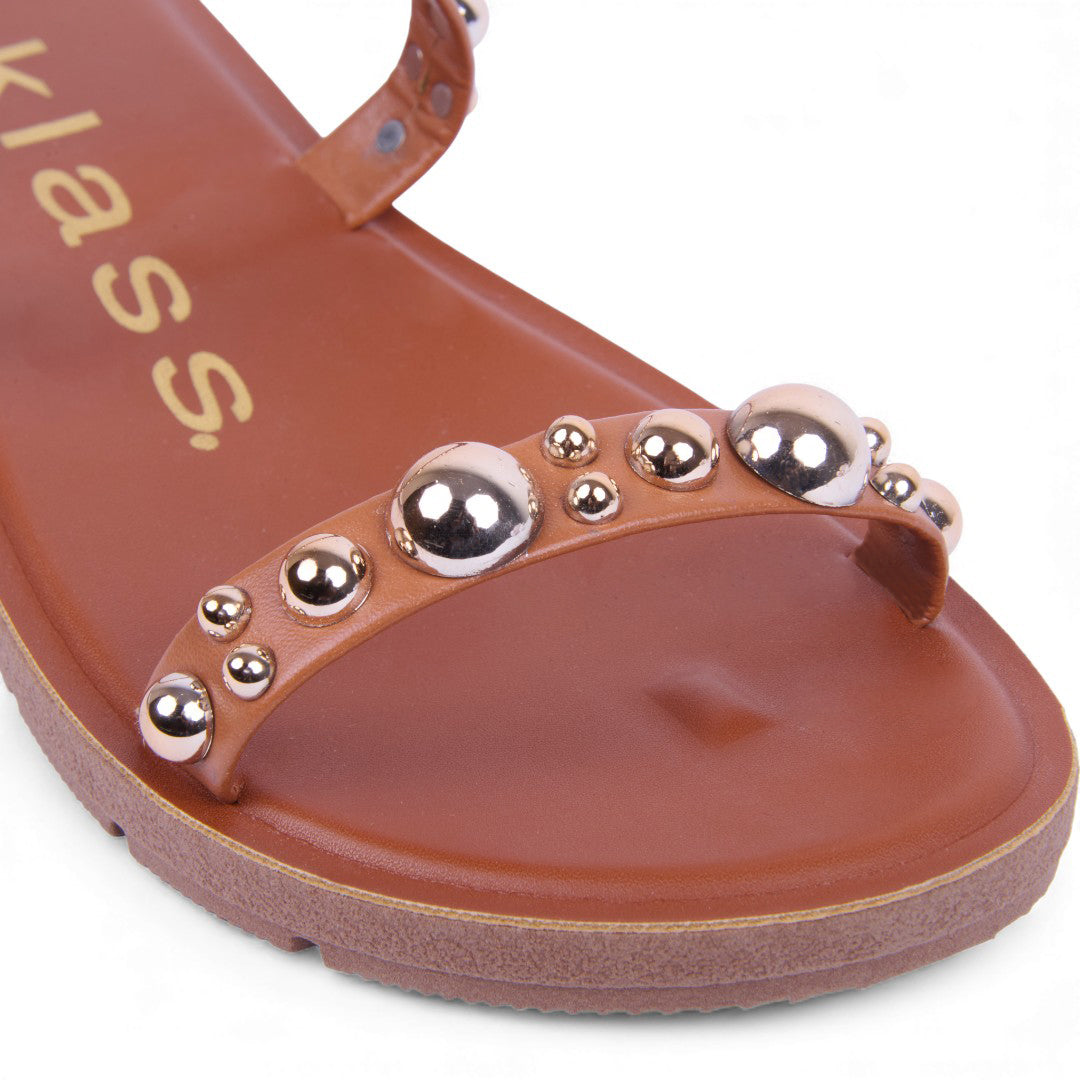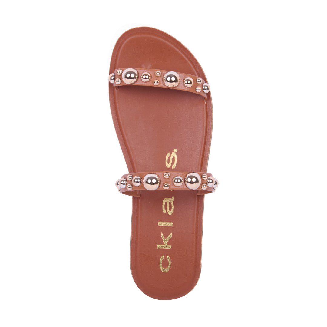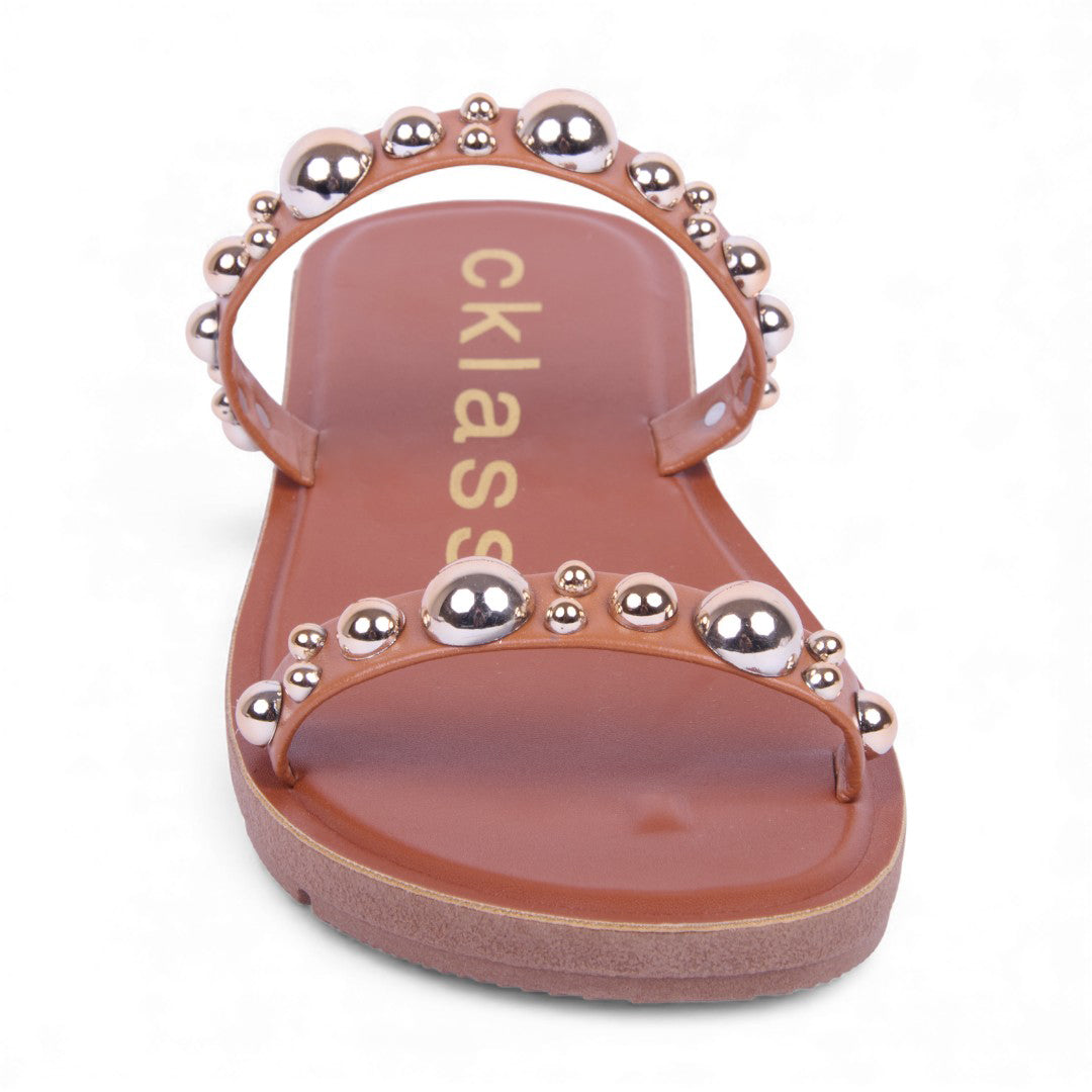Sandalia de piso color miel con látigos decorativos y aplicaciones frontales. Suela ligera y plantilla sintética cómoda ideal para outfits casuales y veraniegos.