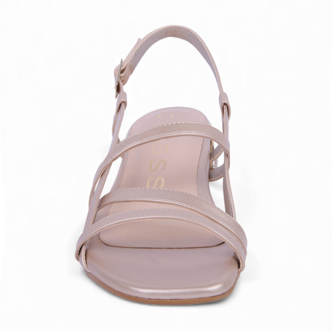 Sandalia de tacón oro de 3 cm con tiras delicadas y pulsera ajustable con hebilla. Elegante, ligera y perfecta para eventos, salidas casuales o looks brillantes.
