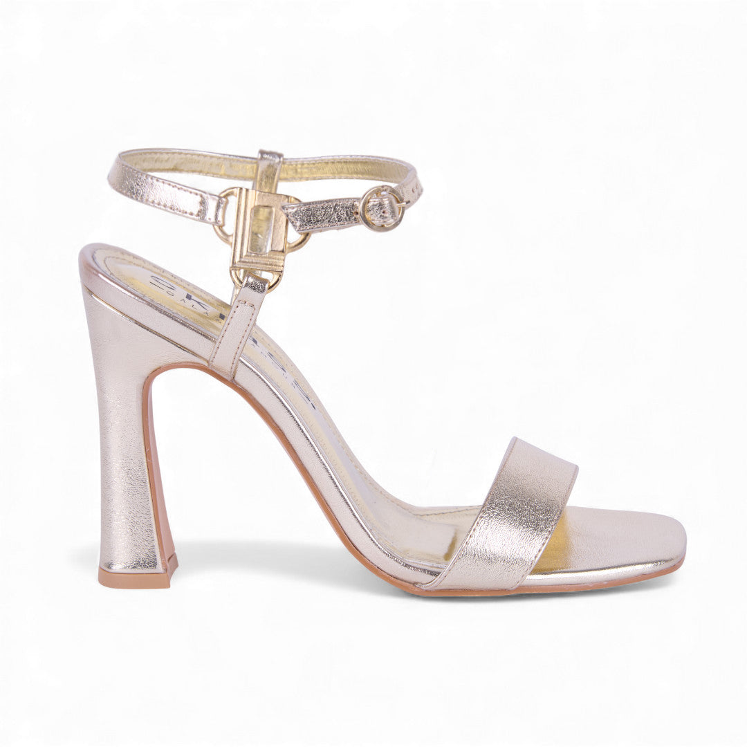 Sandalia oro de tacón alto 10 cm con tira ancha al frente y pulsera al tobillo con hebilla metálica decorativa. Punta cuadrada moderna y diseño elegante para eventos especiales.