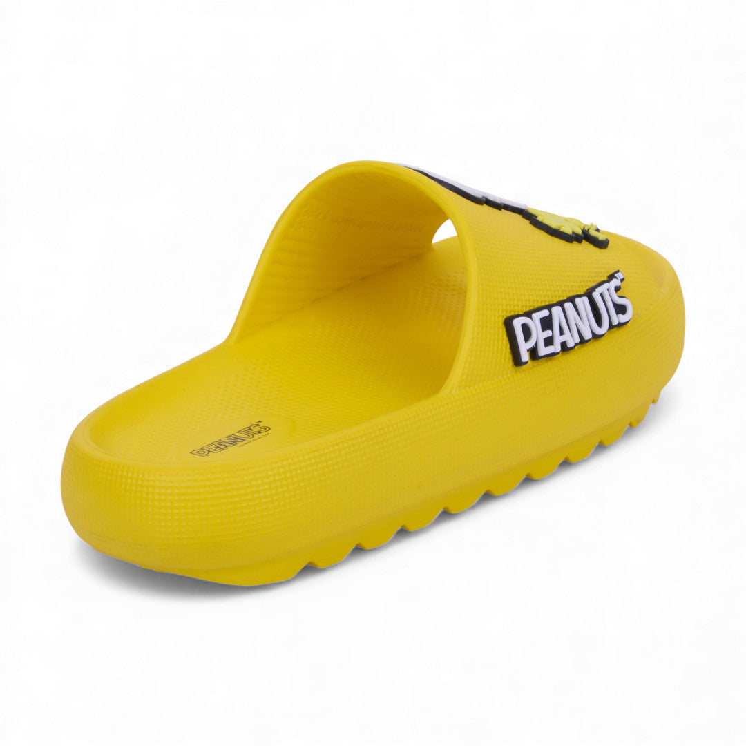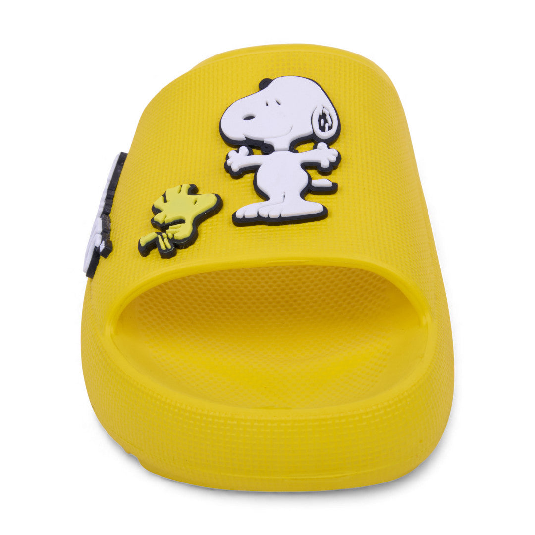 Sandalia color amarillo con divertido gráfico de Snoopy al frente y plantilla con relieve que brinda comodidad y soporte. Fabricada en material sintético resistente y ligero. Ideal para un look relajado, casual o para los fans de Peanuts que buscan comodidad con estilo.