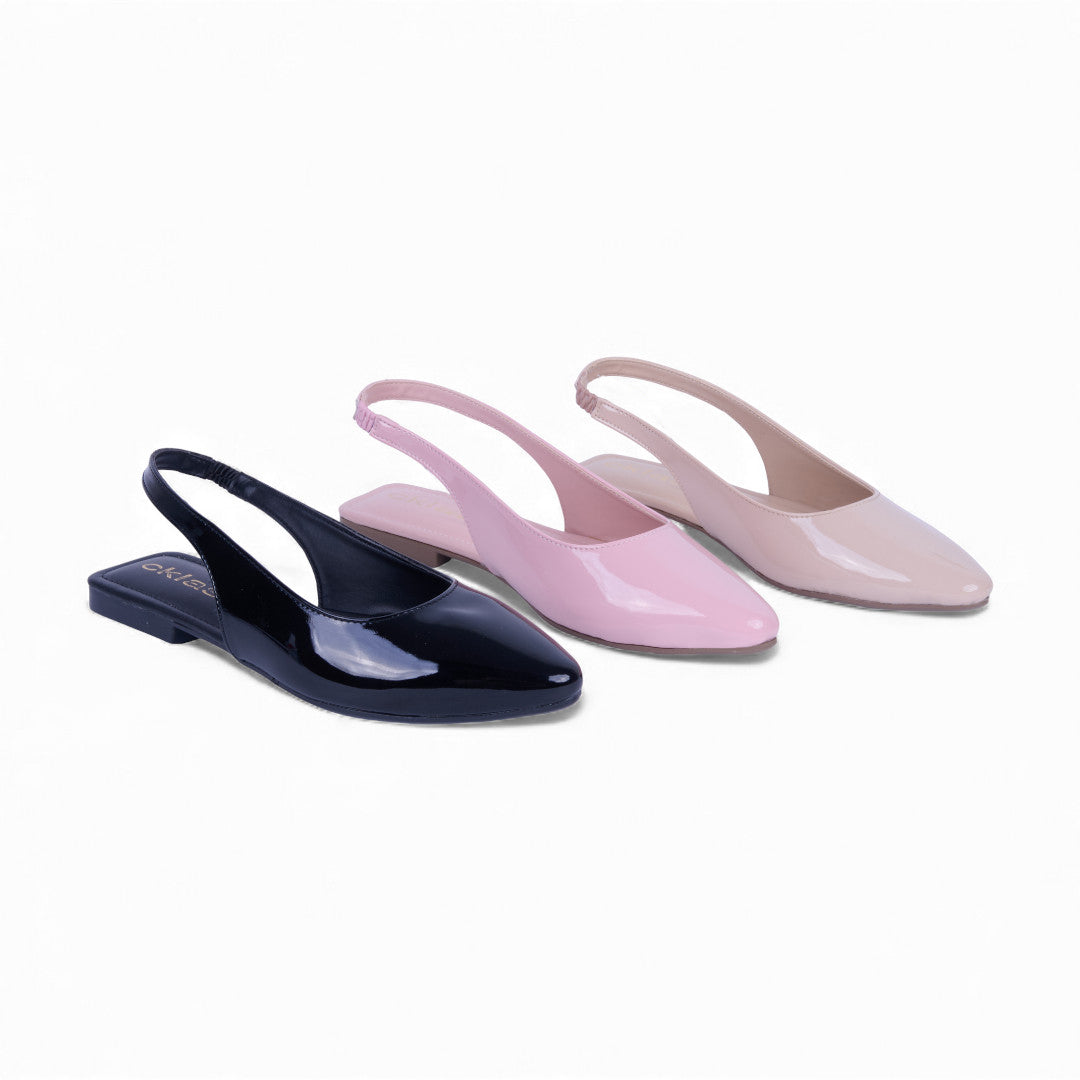 Six de ballerinas de piso destalonadas con látigo ajustable. Plantilla sintética cómoda y suela resistente para uso diario. Colores negro, rosa y hueso modernos y versátiles. Ideales para outfits casuales, paseos y eventos con estilo femenino y sofisticado.