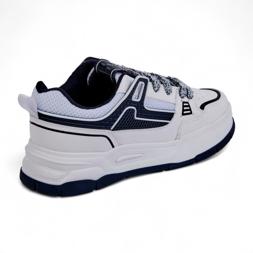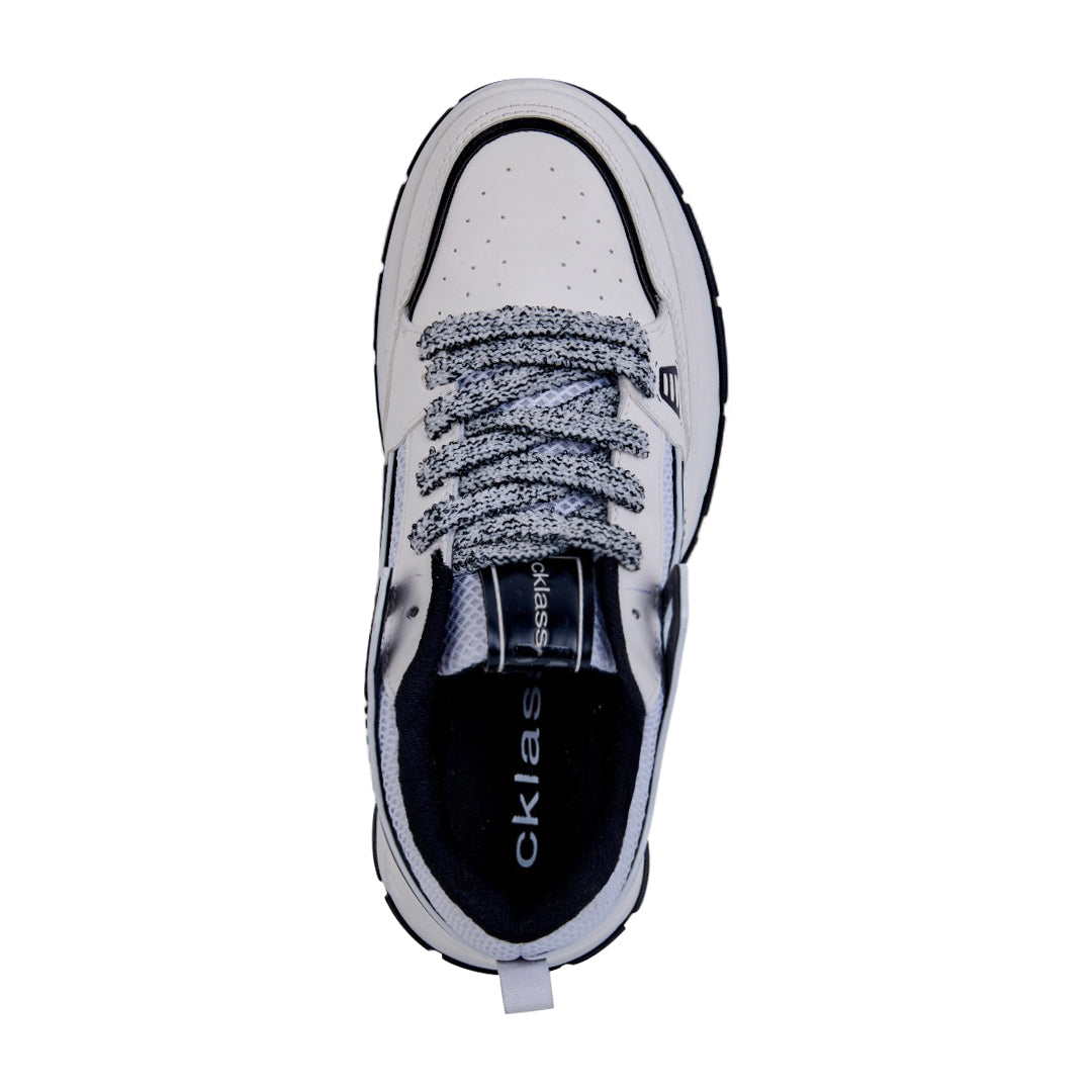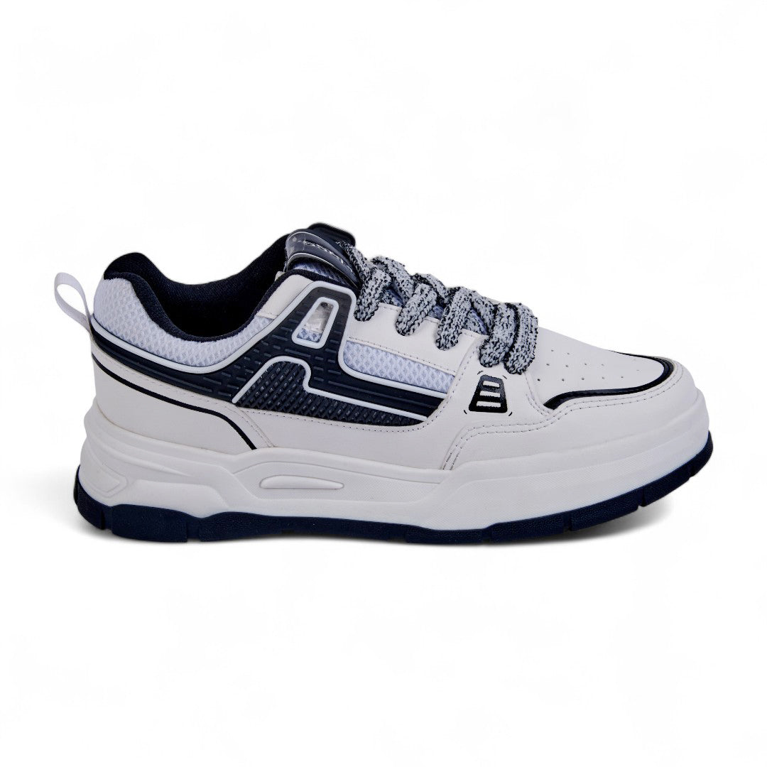 Tenis de piso color blanco con cintas y detalle en negro, diseño moderno y versátil con plantilla textil suave ideal para uso diario.