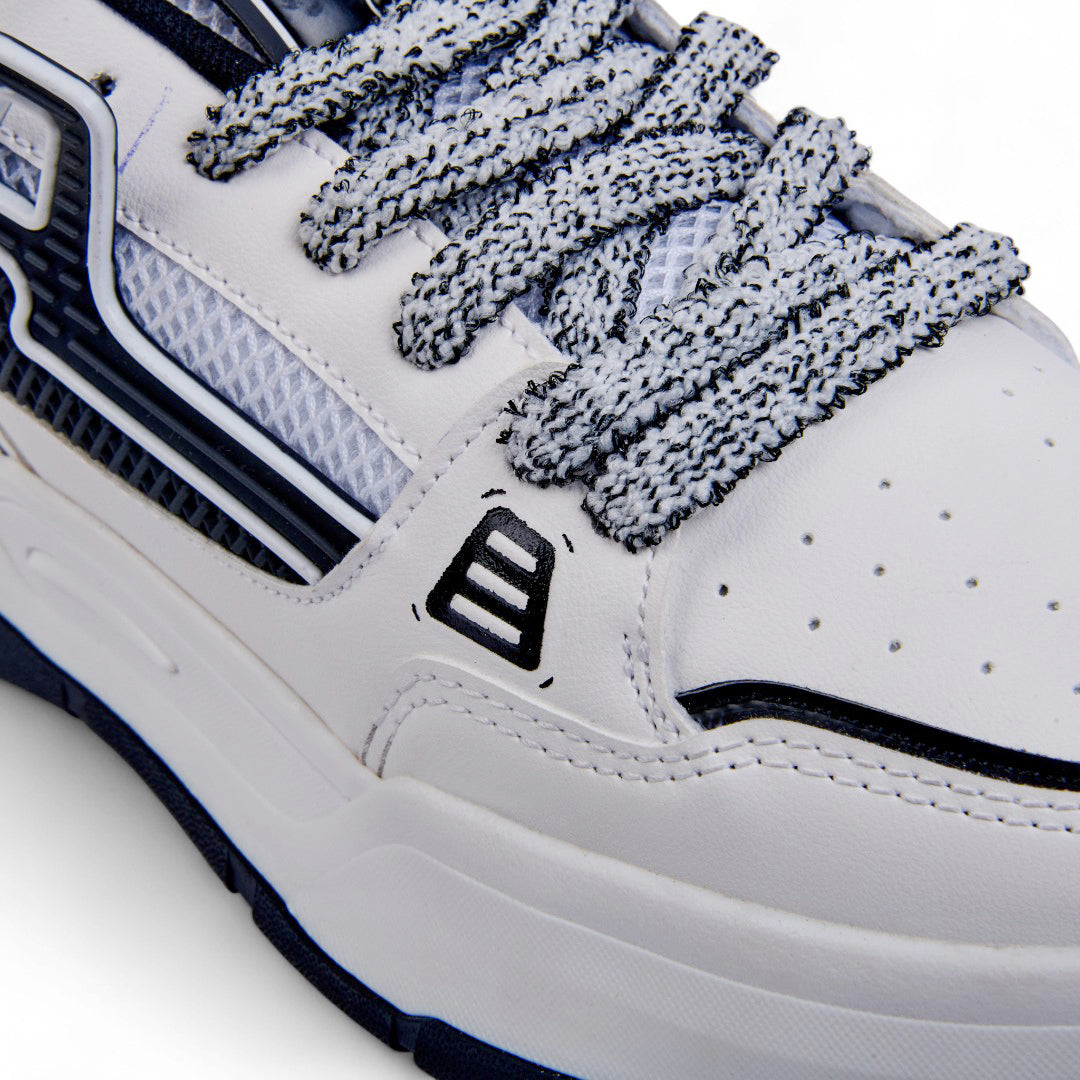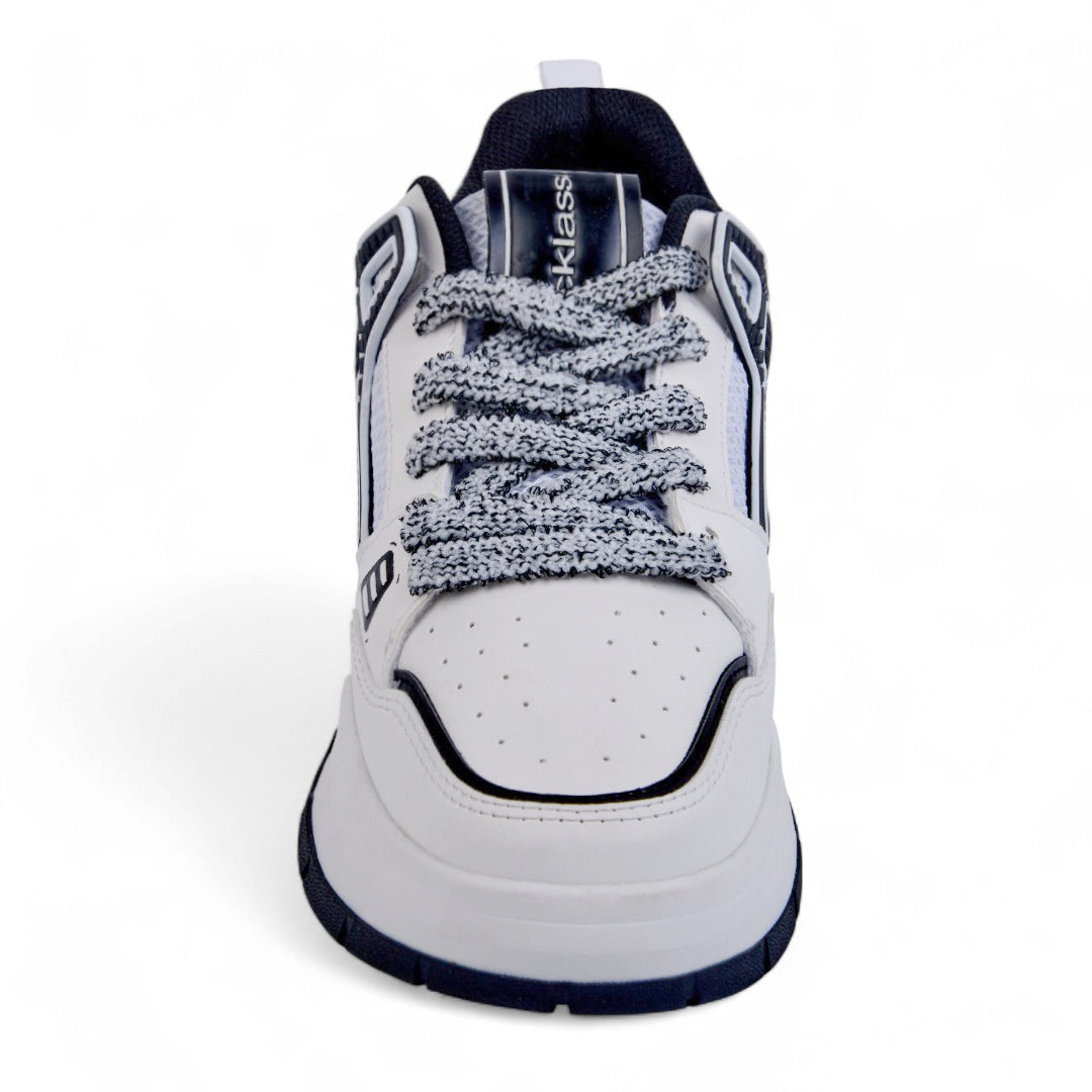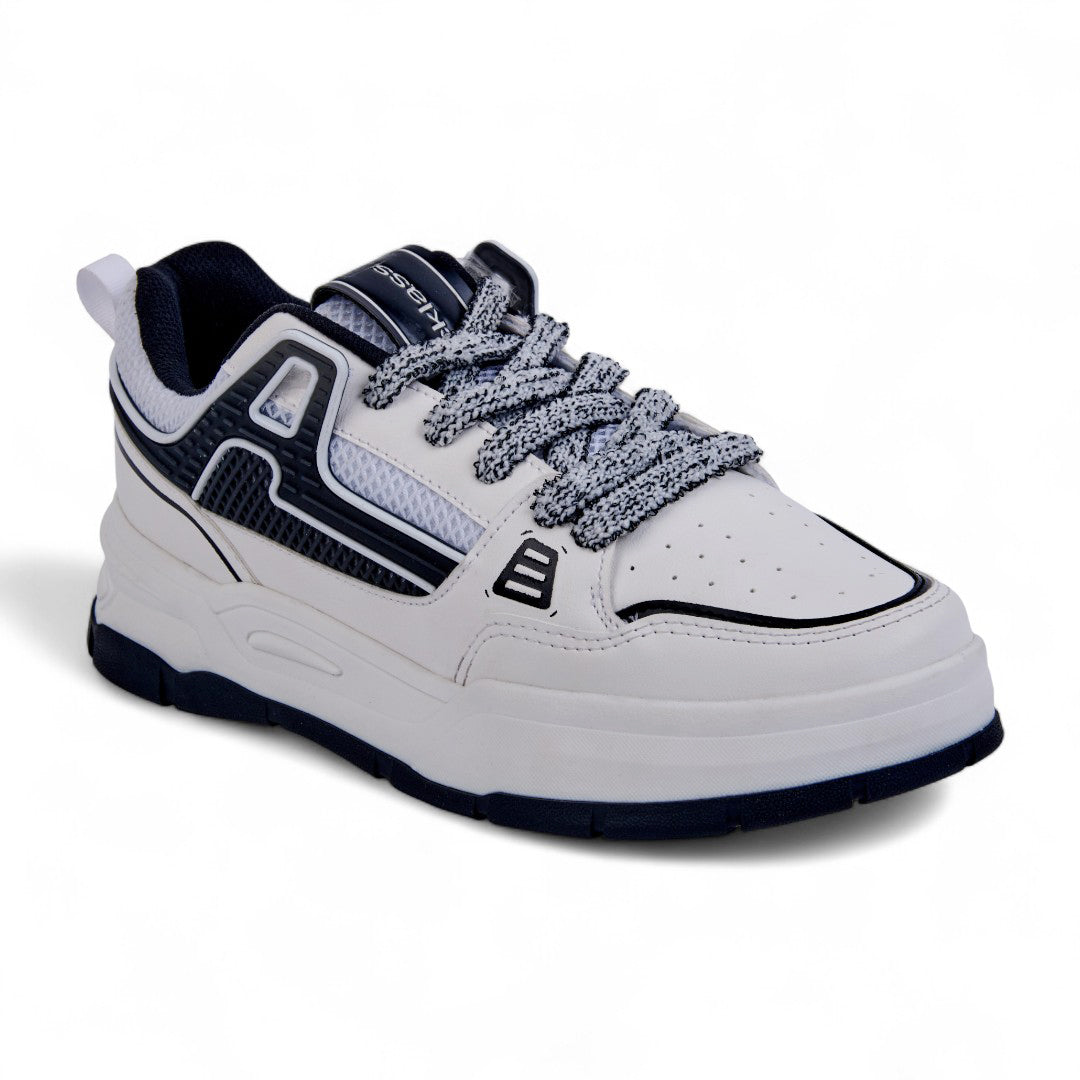 Tenis de piso color blanco con cintas y detalle en negro, diseño moderno y versátil con plantilla textil suave ideal para uso diario.