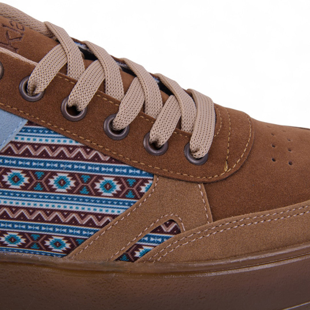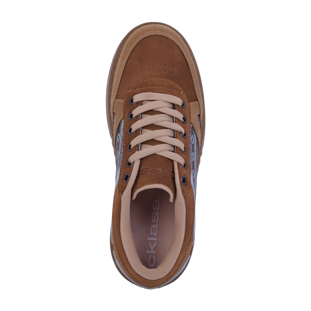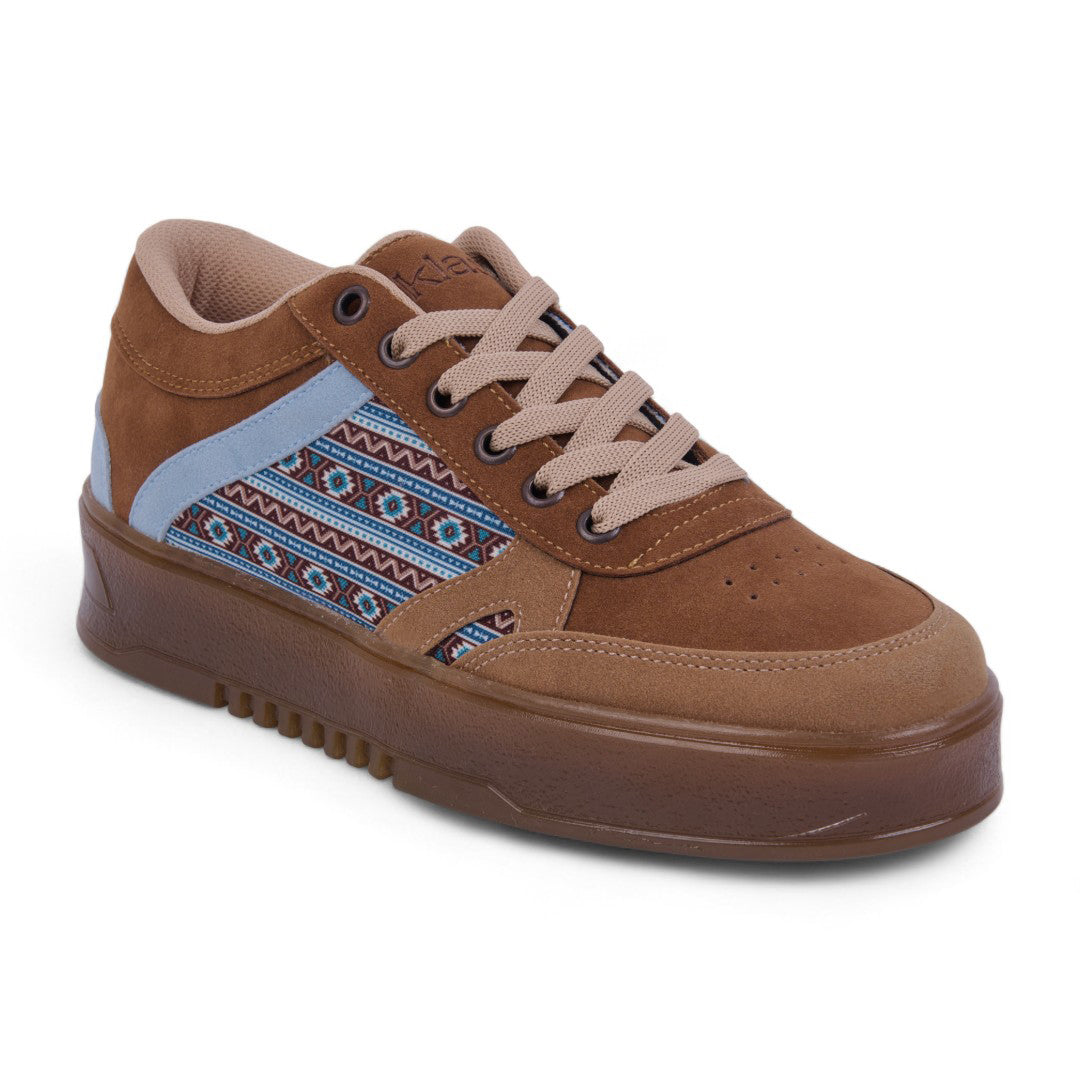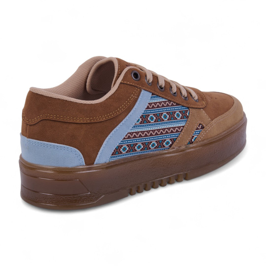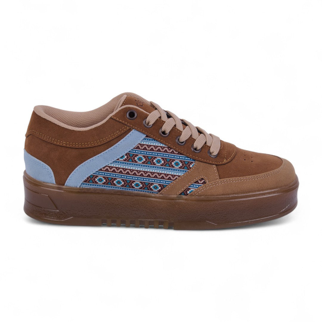 Tenis de piso color miel para dama con estampado azul en costados y diseño con cintas. Su suela ligera y flexible ofrece comodidad diaria, mientras que la plantilla textil brinda suavidad en cada paso. Ideales para looks casuales, urbanos o relajados gracias a su estilo moderno y versátil.