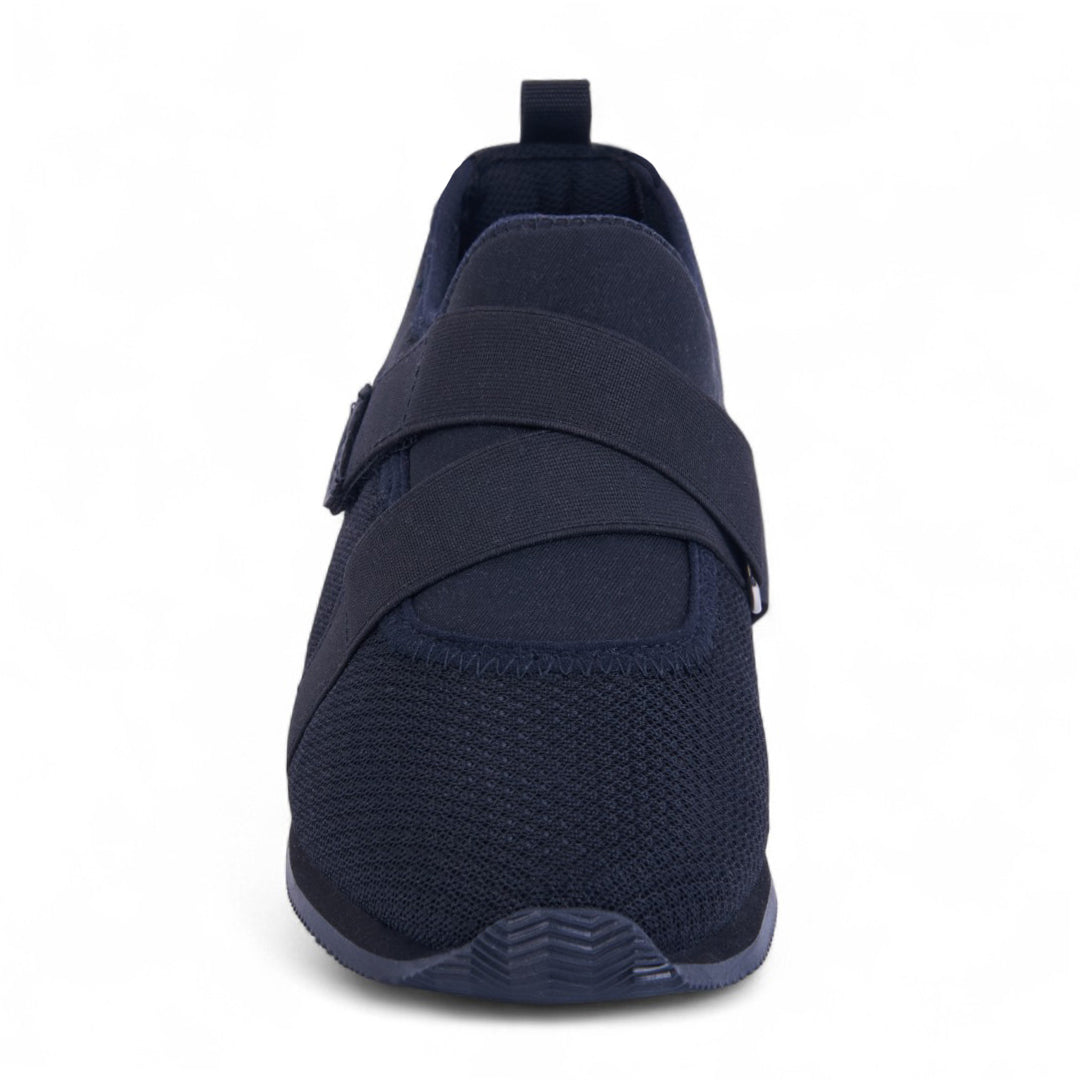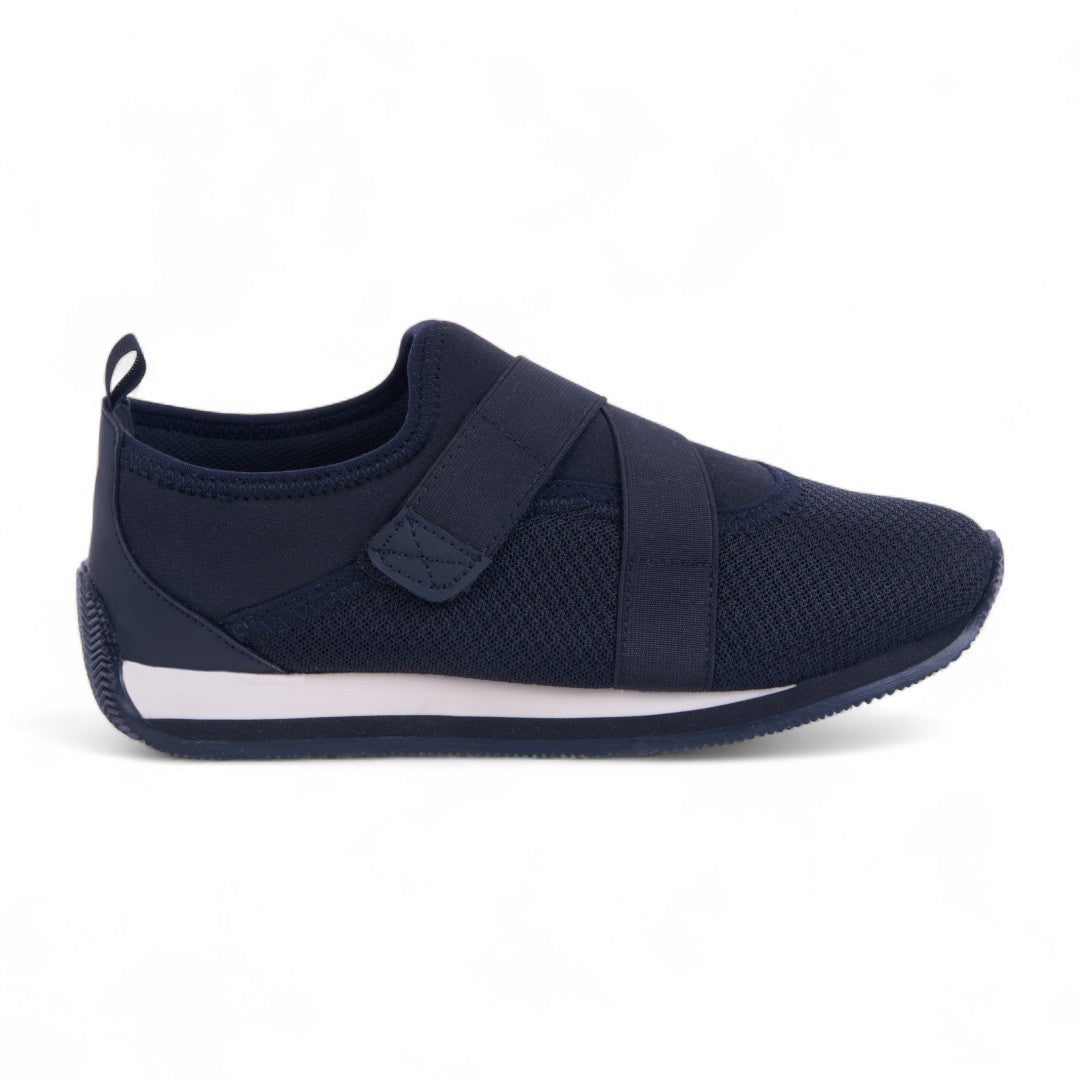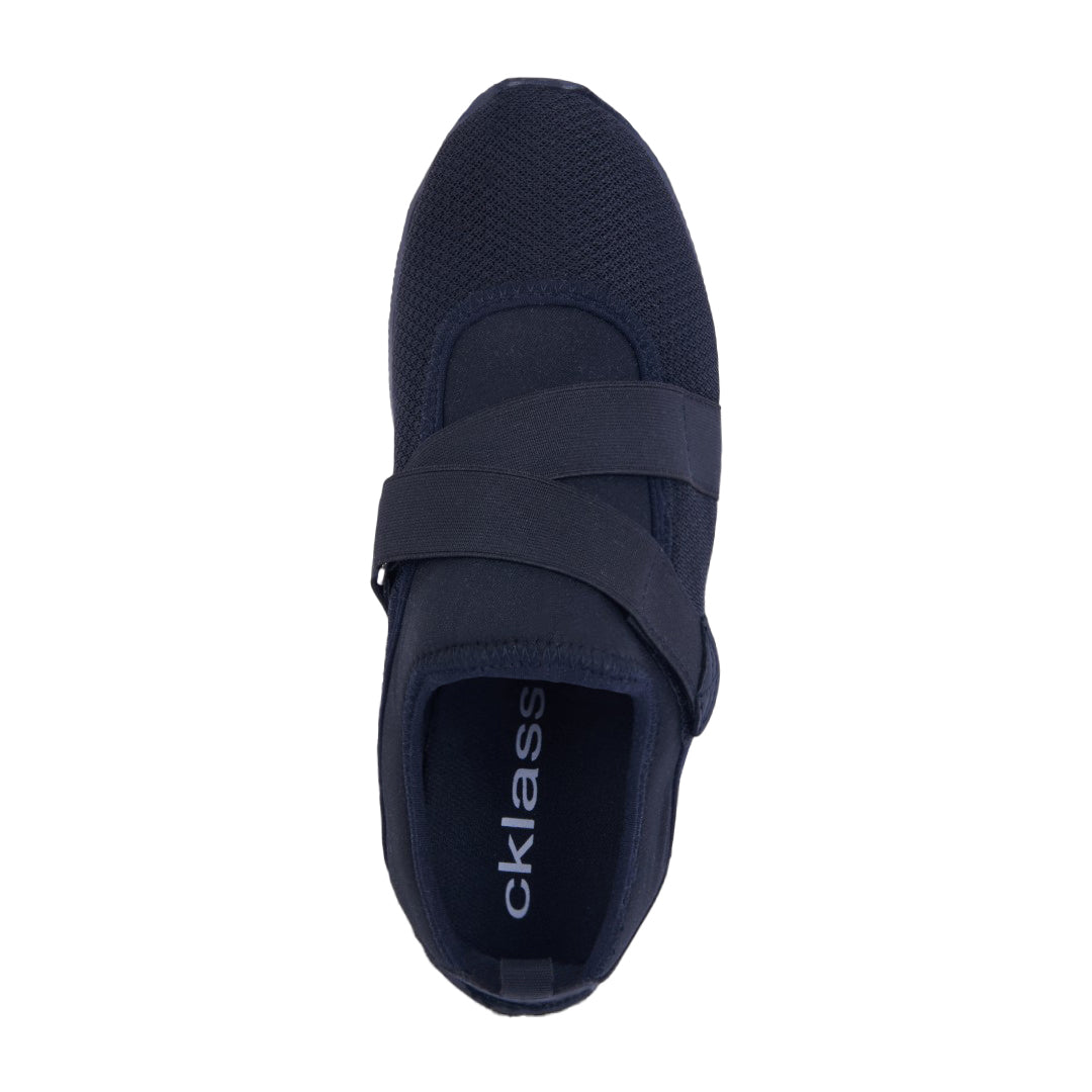 Tenis de piso tipo calcetín en tejido knit negro transpirable con bandas elásticas cruzadas y plantilla textil suave. Diseño flexible, ligero y moderno para uso diario.