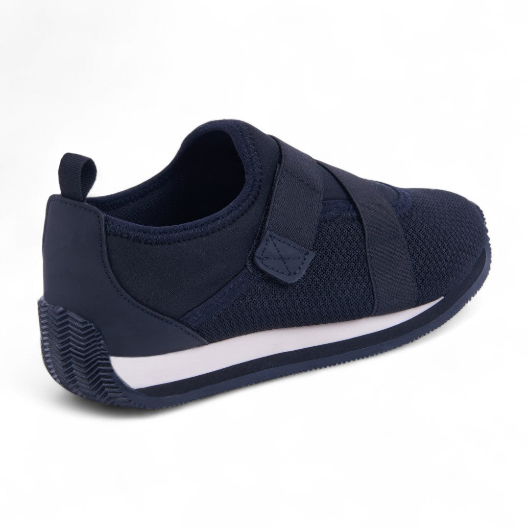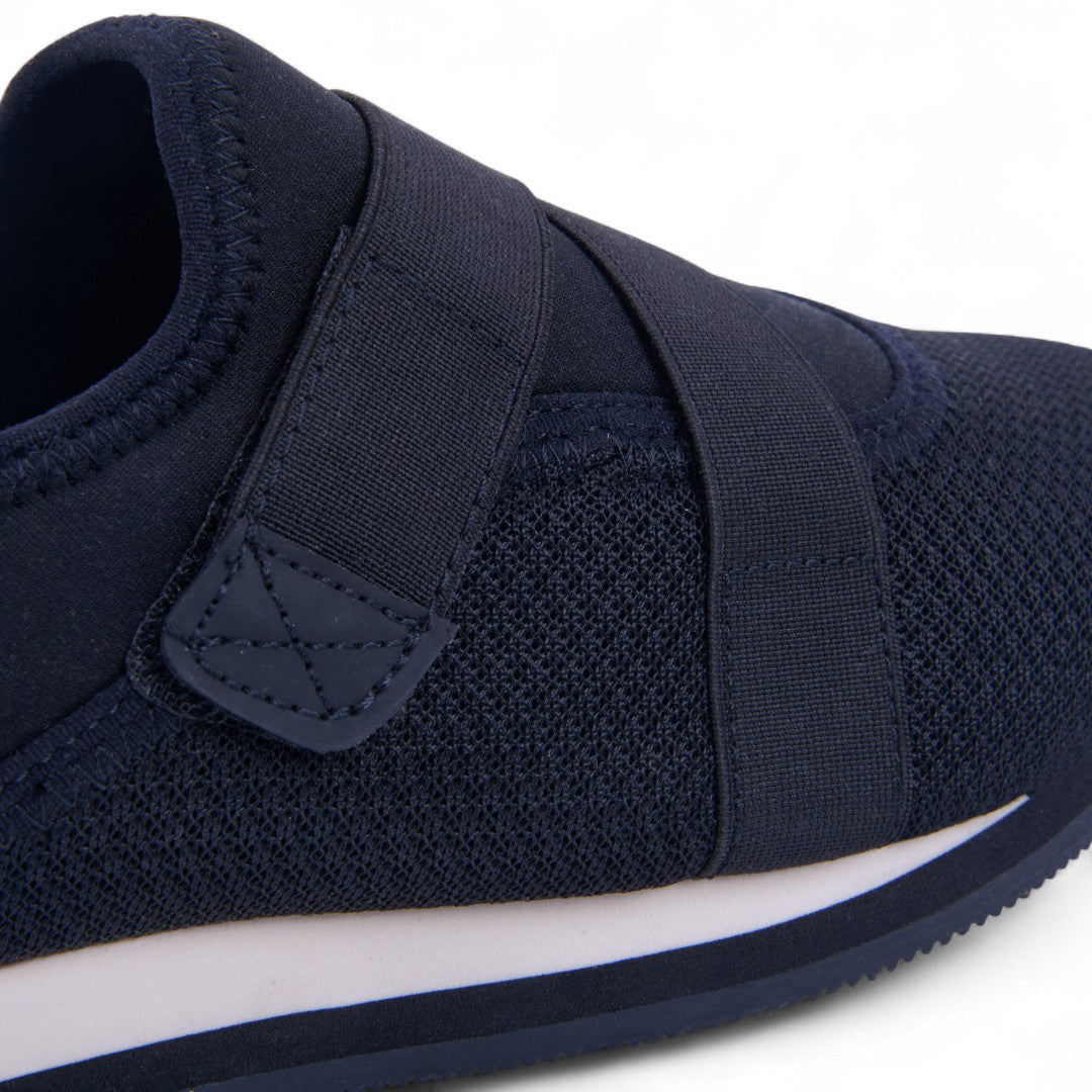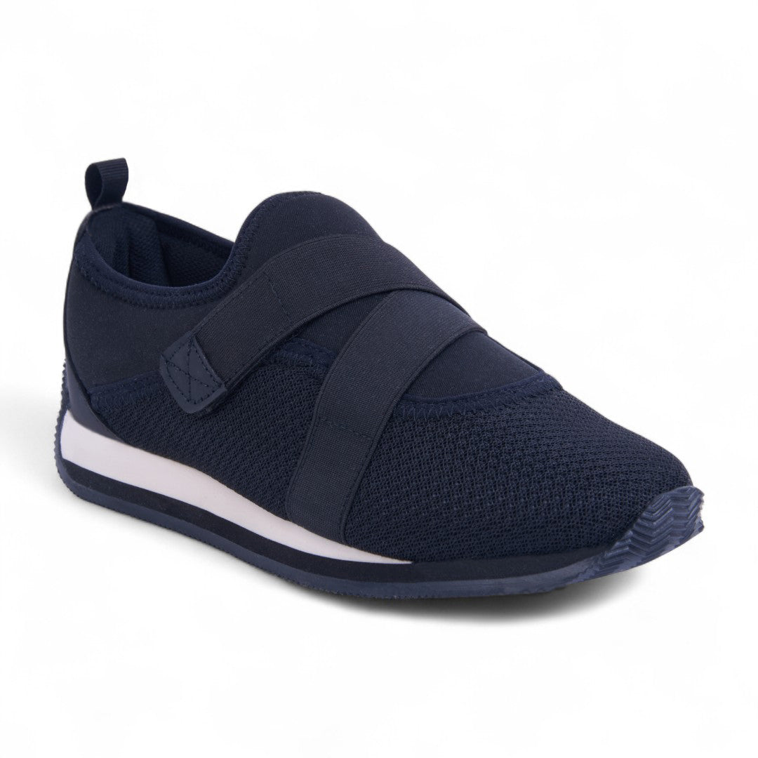 Tenis de piso tipo calcetín en tejido knit negro transpirable con bandas elásticas cruzadas y plantilla textil suave. Diseño flexible, ligero y moderno para uso diario.