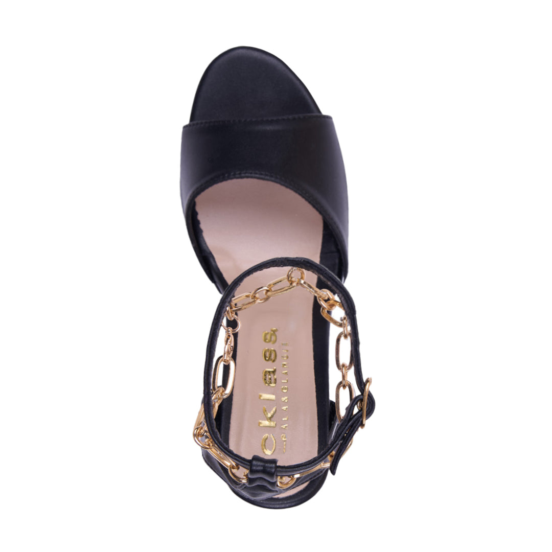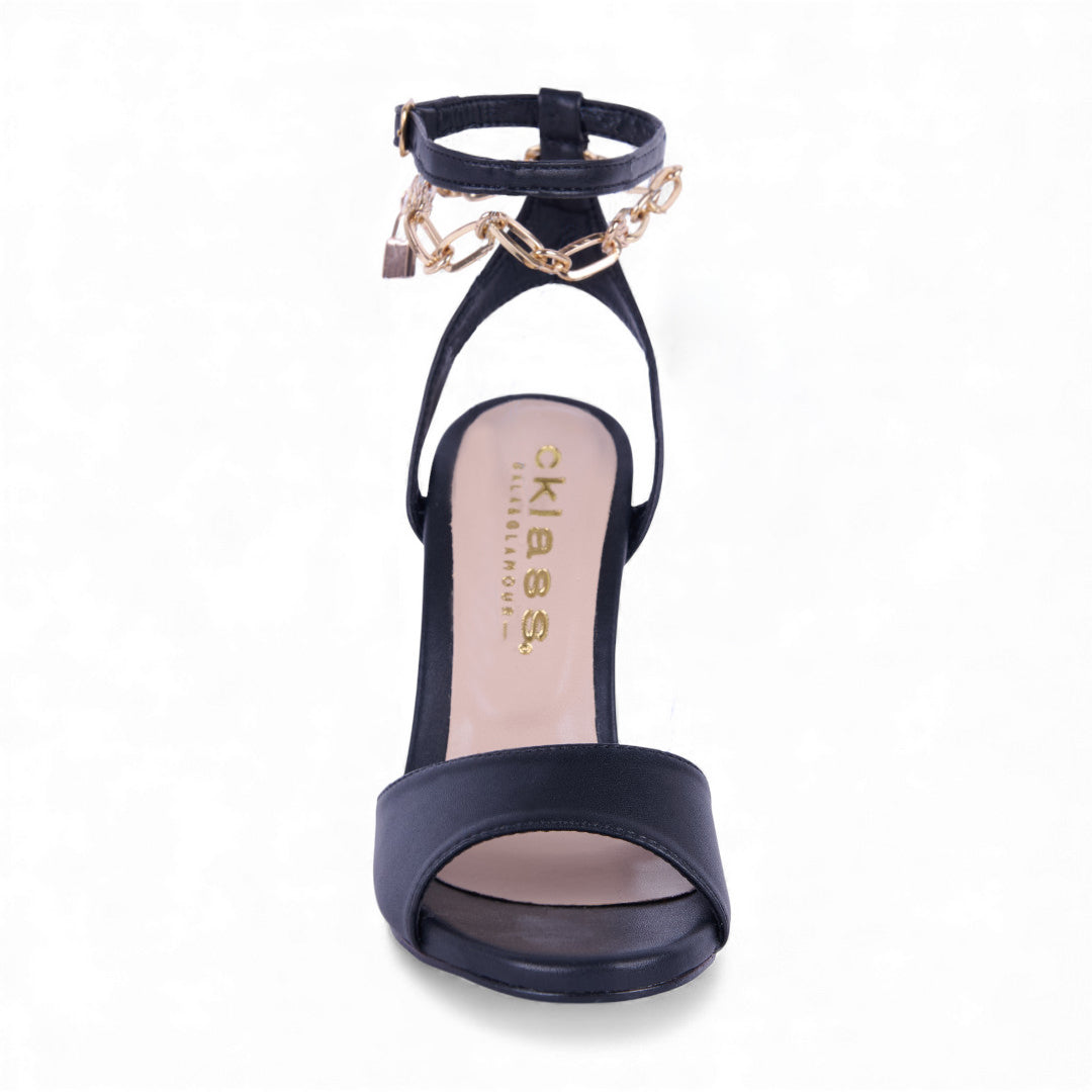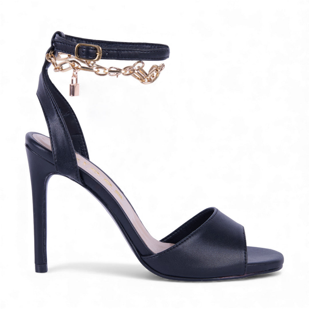 Zapatilla de tacón de 10 cm. con diseño con tira ancha al frente y pulsera ajustable al tobillo complementada con cadena dorada decorativa. Tacón alto con detalle metálico y punta redondeada, plantilla sintética color negro. Material: Sintético.
