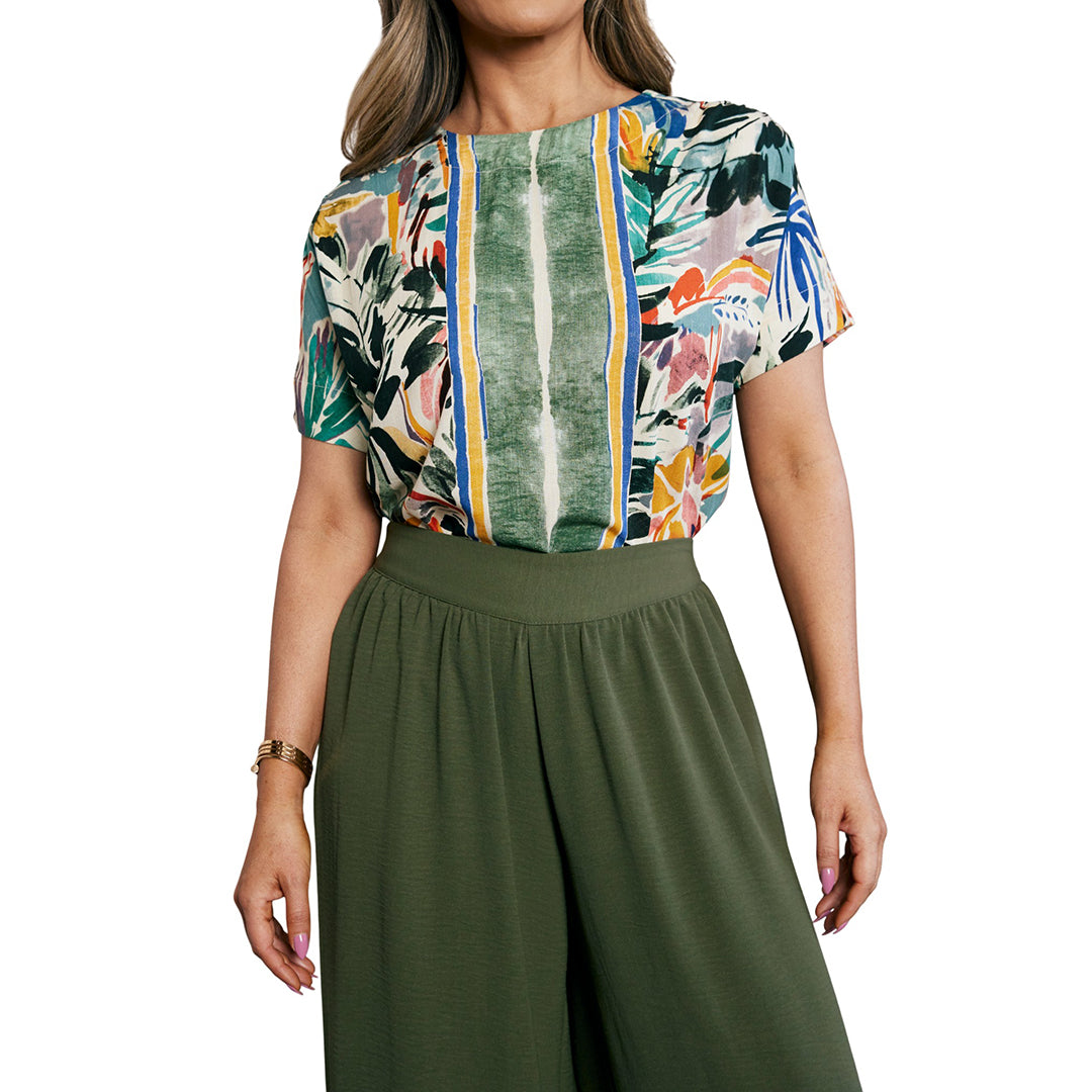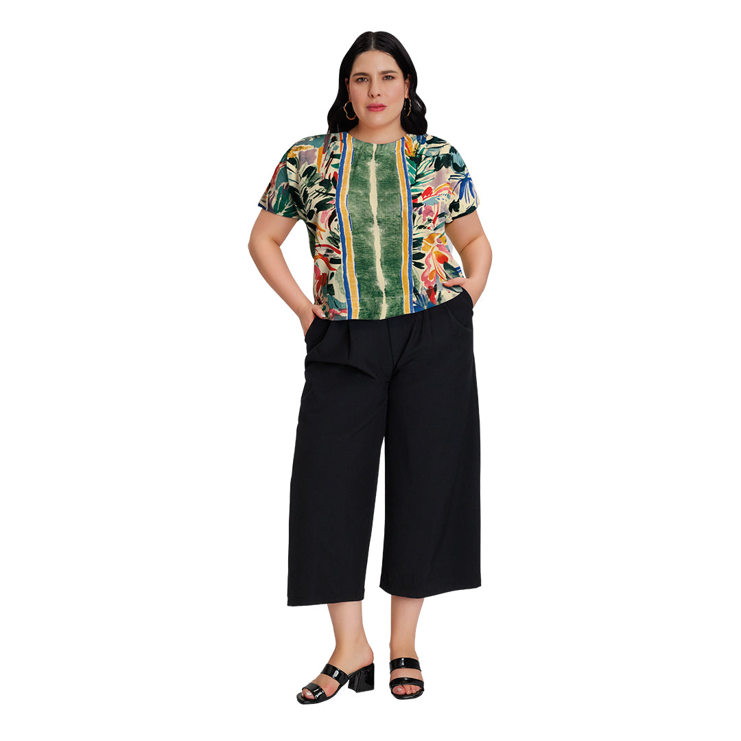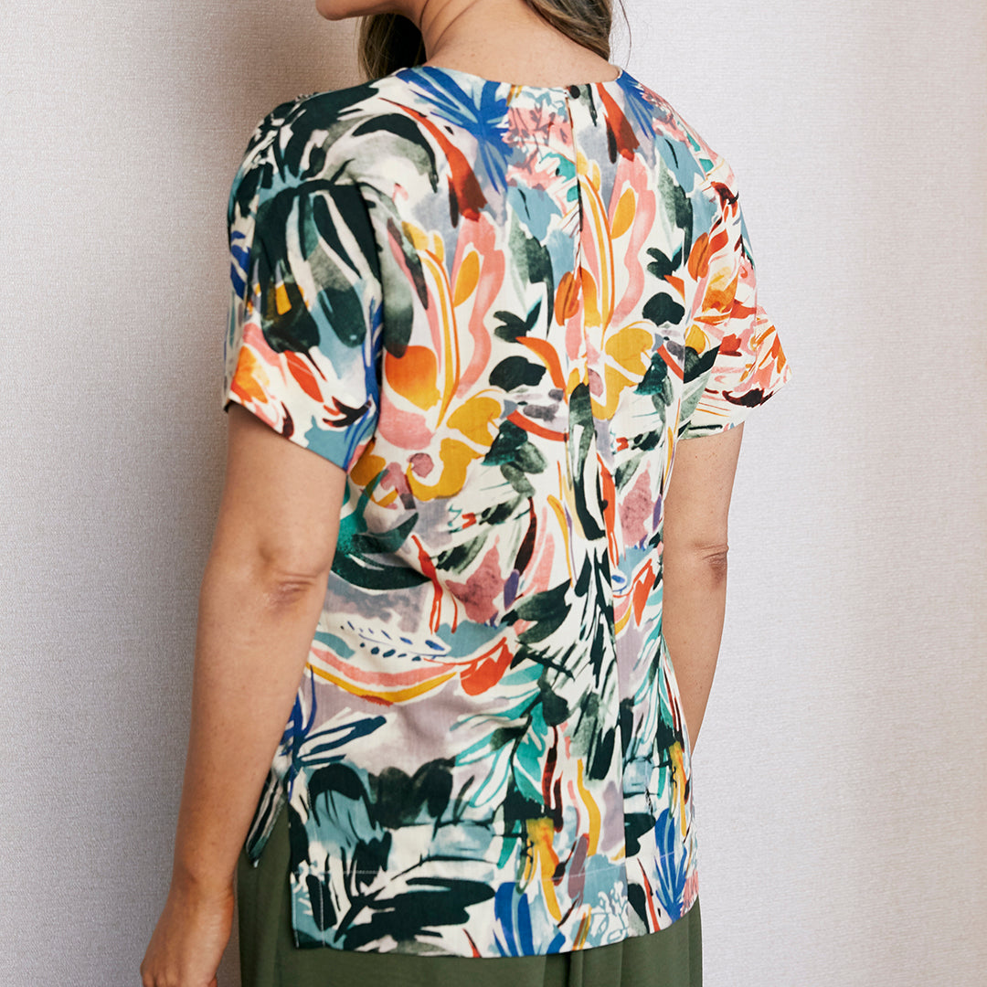 Blusa multicolor floral con escote redondo, manga caída y largo asimétrico. Detalles delicados en hombros y costados. Suave y fresca para el día a día.