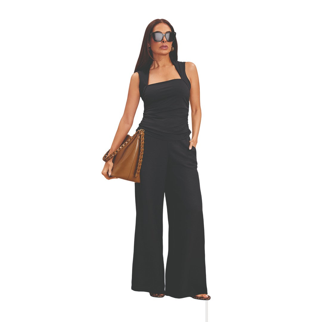 Blusa color negro con elegante escote cuadrado que realza el cuello y el rostro. Presenta delicados pliegues en los costados que generan un efecto drapeado favorecedor. De corte slim que moldea la figura, confeccionada en mezcla de poliéster y elastano para un ajuste cómodo, elástico y sofisticado. Ideal para combinar con faldas o pantalones en outfits casuales o formales.