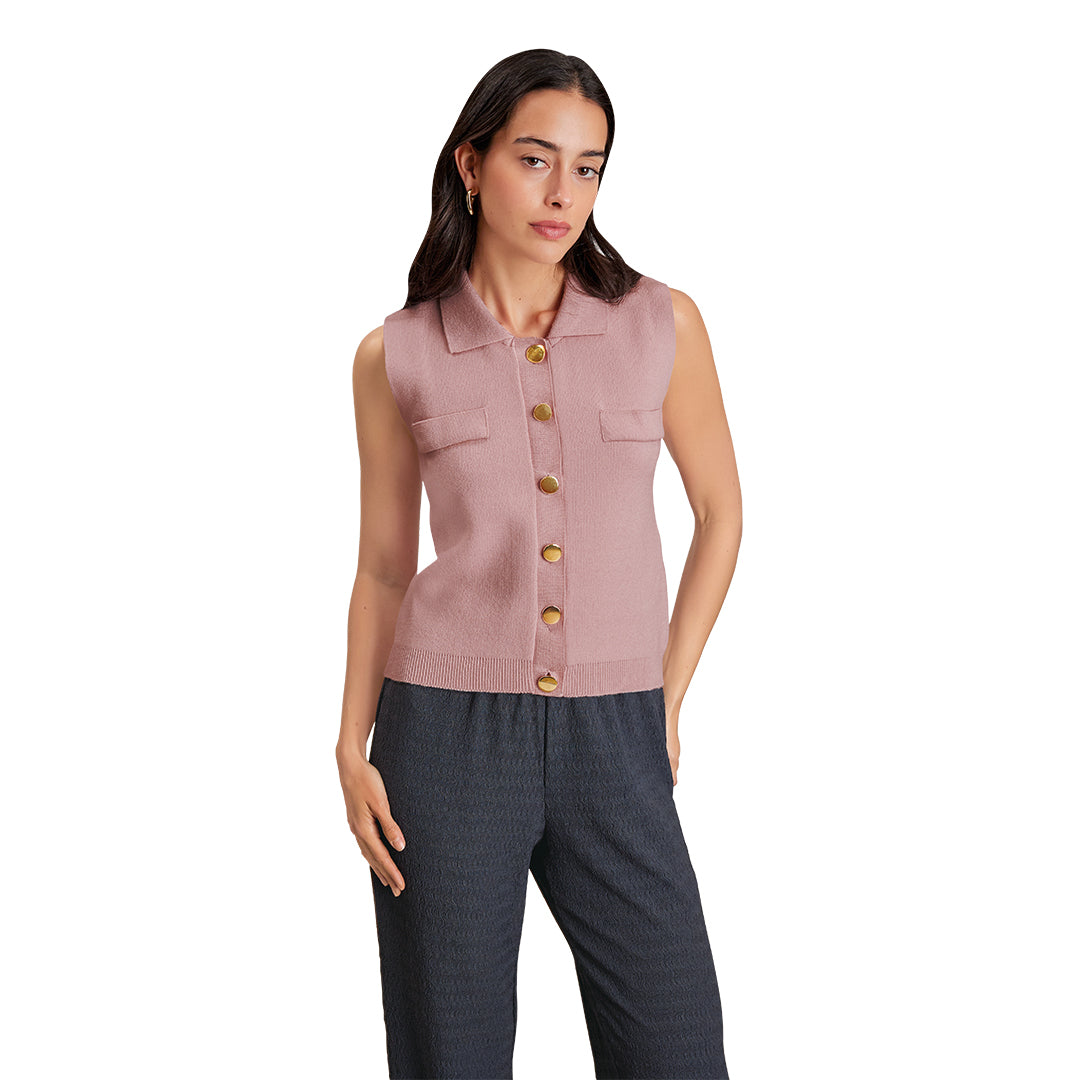 Blusa rosa de punto con cuello tipo polo y botones metálicos dorados en aletilla. Bolsillos decorativos que aportan estilo elegante. Corte regular cómodo y versátil. Ideal para looks casuales, urbanos o combinaciones femeninas con confort y tendencia.