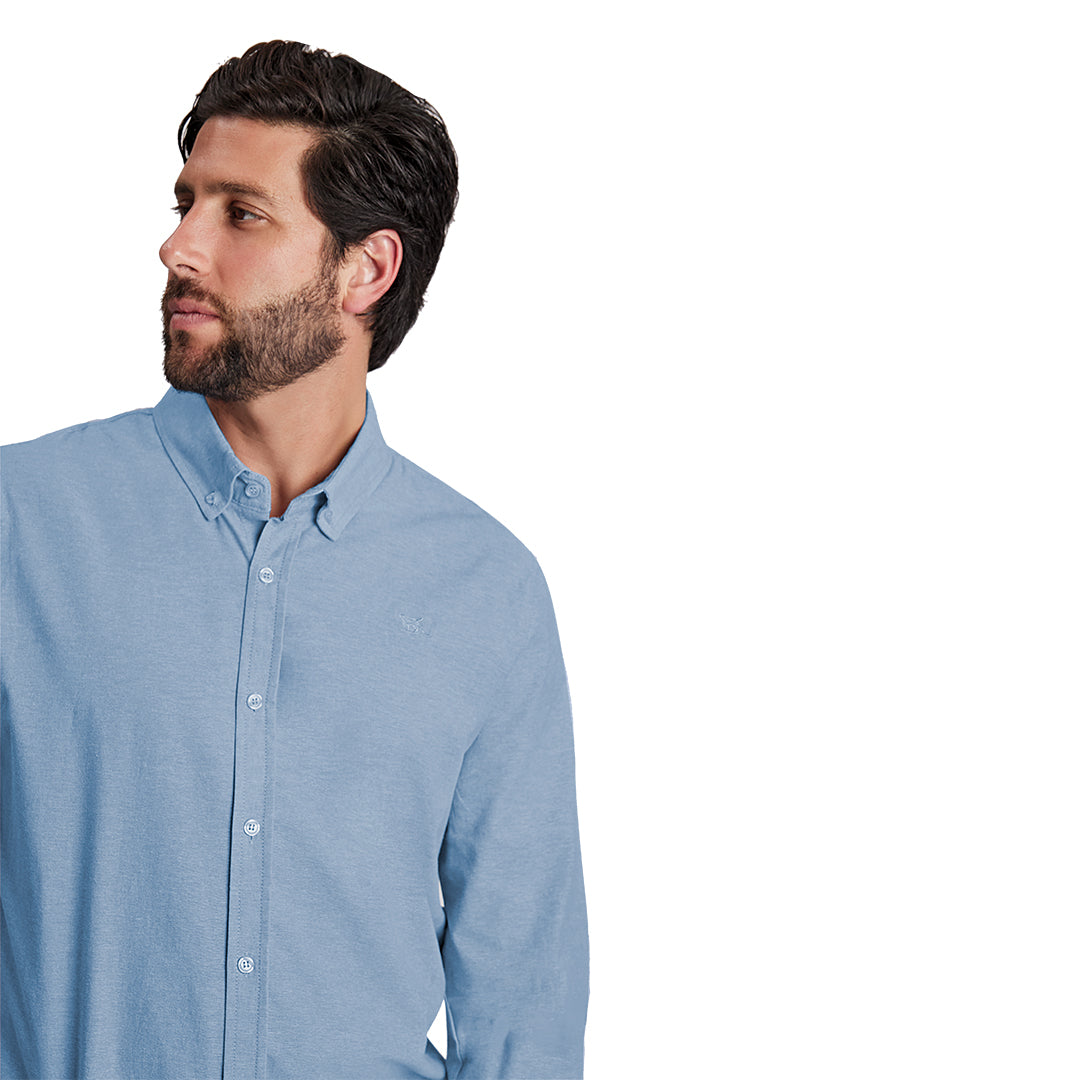 Camisa azul de manga larga, cuello abotonado, puños con botón y corte regular; clásica, fresca y perfecta para looks casuales o formales.