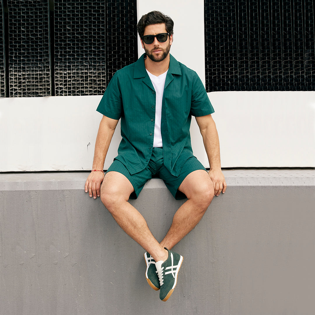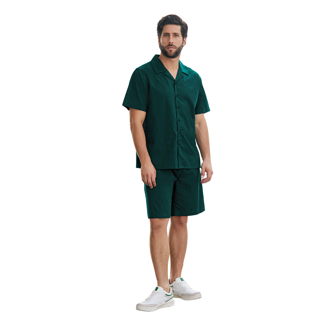 Camisa verde con cuello resort, manga corta y tela texturizada con botones al frente; fresca, moderna y perfecta para outfits relajados con estilo clásico contemporáneo.