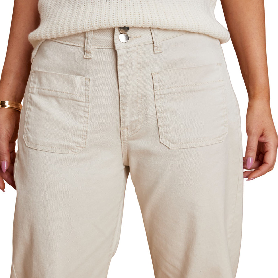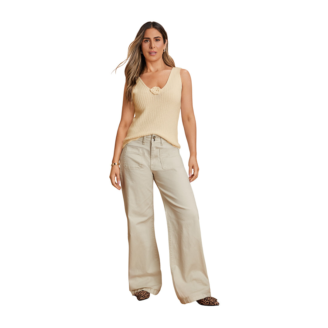 Jeans color beige con doble botón en la pretina y corte recto amplio a la cadera. Presenta bolsas delanteras y traseras funcionales. Confeccionado en mezcla de algodón y elastano que ofrece suavidad, flexibilidad y comodidad. Un diseño moderno, fresco y versátil ideal para crear looks casuales o de oficina con un estilo natural y elegante.