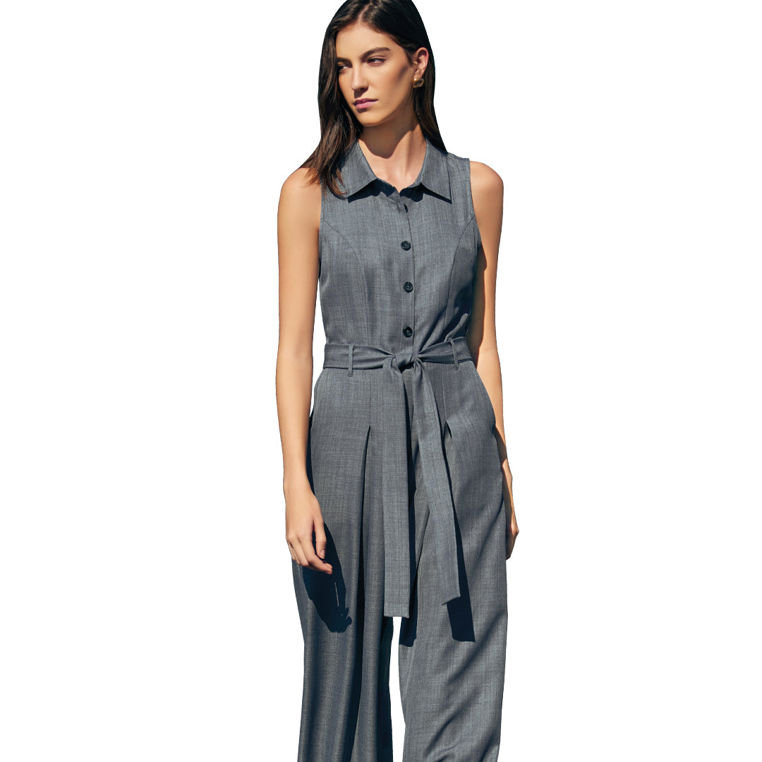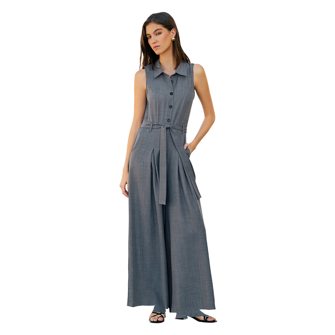 Jumpsuit azul mezclilla sin mangas, cuello camisero y botones frontales; pantalón de pata ancha con pinzas, bolsillos y cinturón a juego. Moderno, cómodo y favorecedor.