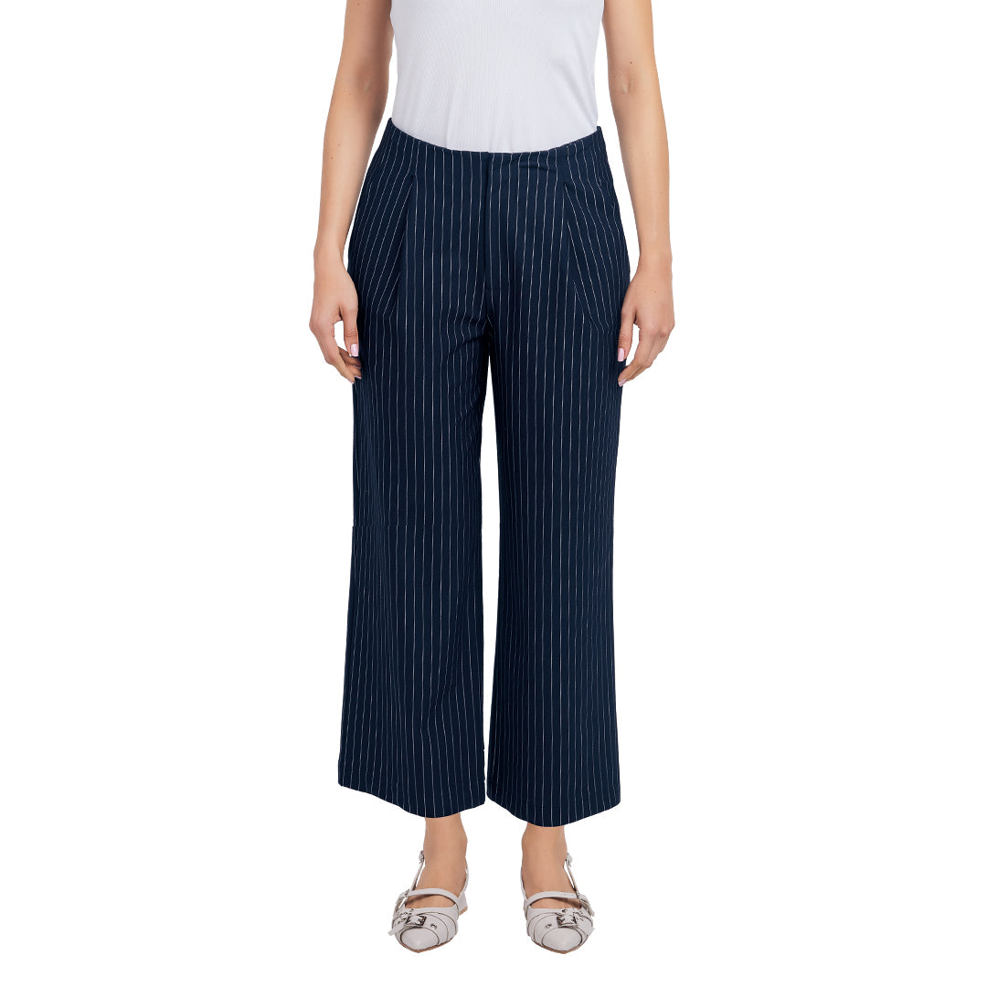 Pantalón marino corte culotte con tiro alto, pinzas decorativas, bolsillos frontales, raya diplomática y pata ancha; sofisticado, moderno y perfecto para looks profesionales o moda casual elevada.