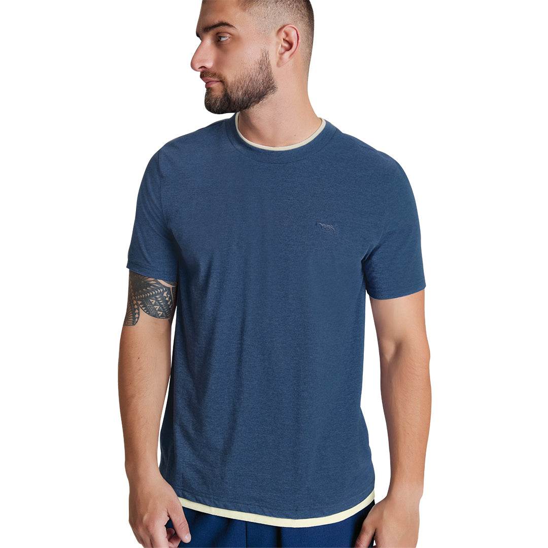 Playera azul para hombre de manga corta y cuello redondo, con detalle de contraste en parte baja que aporta un toque moderno. Confeccionada en algodón y poliéster, ofrece comodidad y durabilidad. Ideal para looks casuales y urbanos.