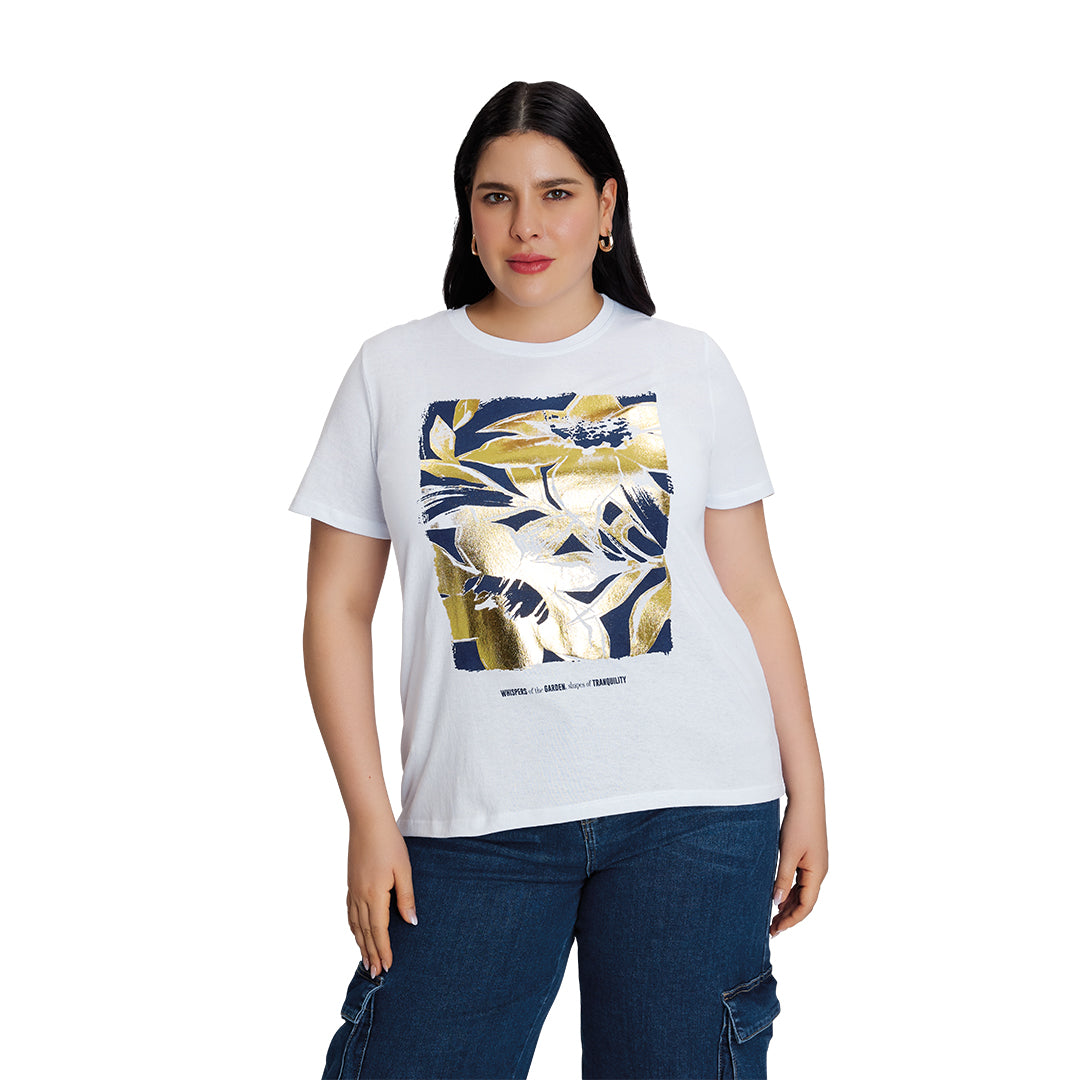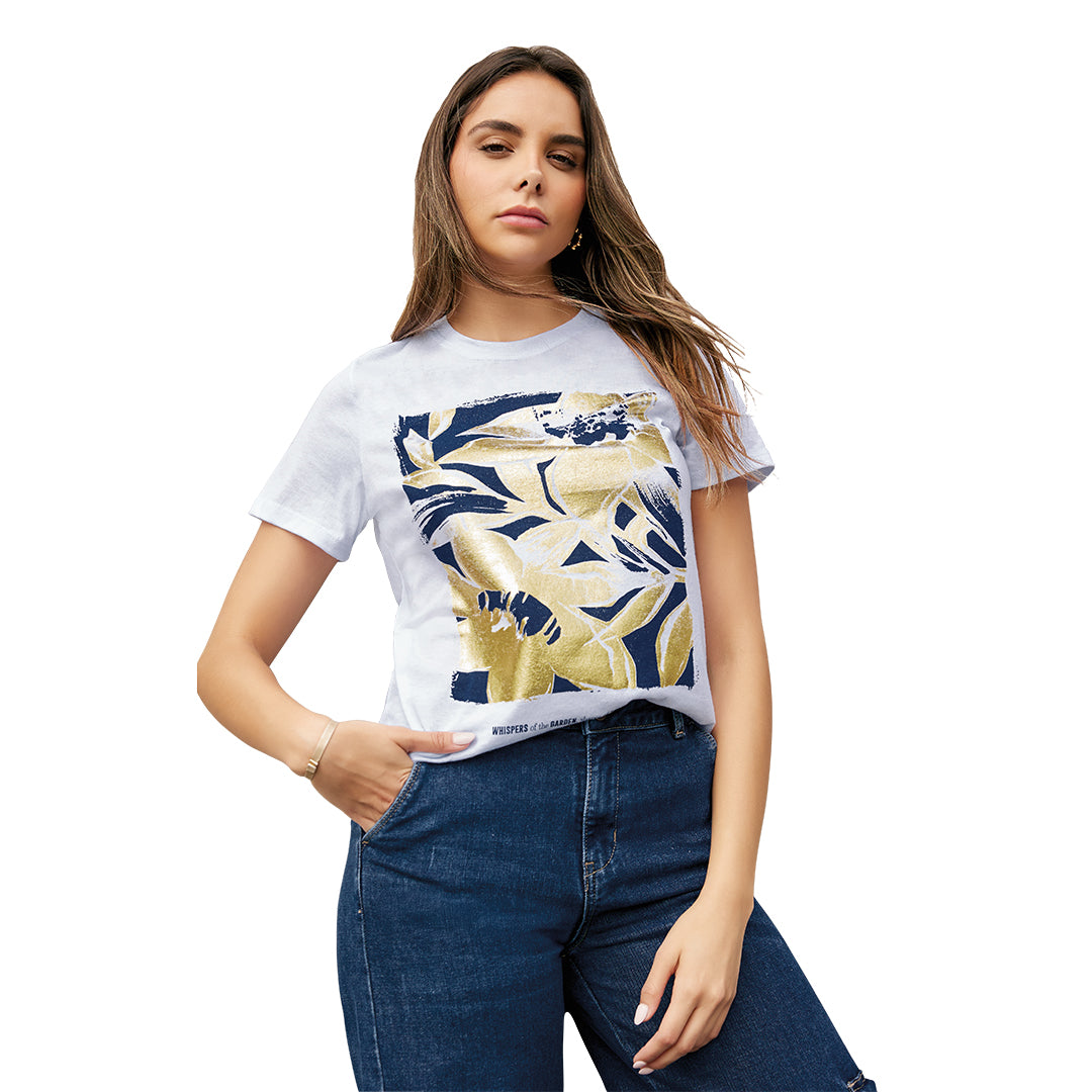 Playera color blanco con cuello redondo tipo cardigán y manga corta. Presenta un delicado estampado floral metalizado que aporta un toque femenino y sofisticado. De corte regular y confeccionada en suave mezcla de algodón y poliéster para mayor frescura y confort. Ideal para combinar con jeans, faldas o shorts en looks casuales y modernos.