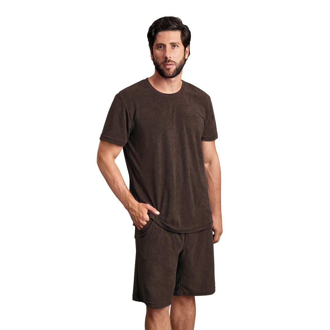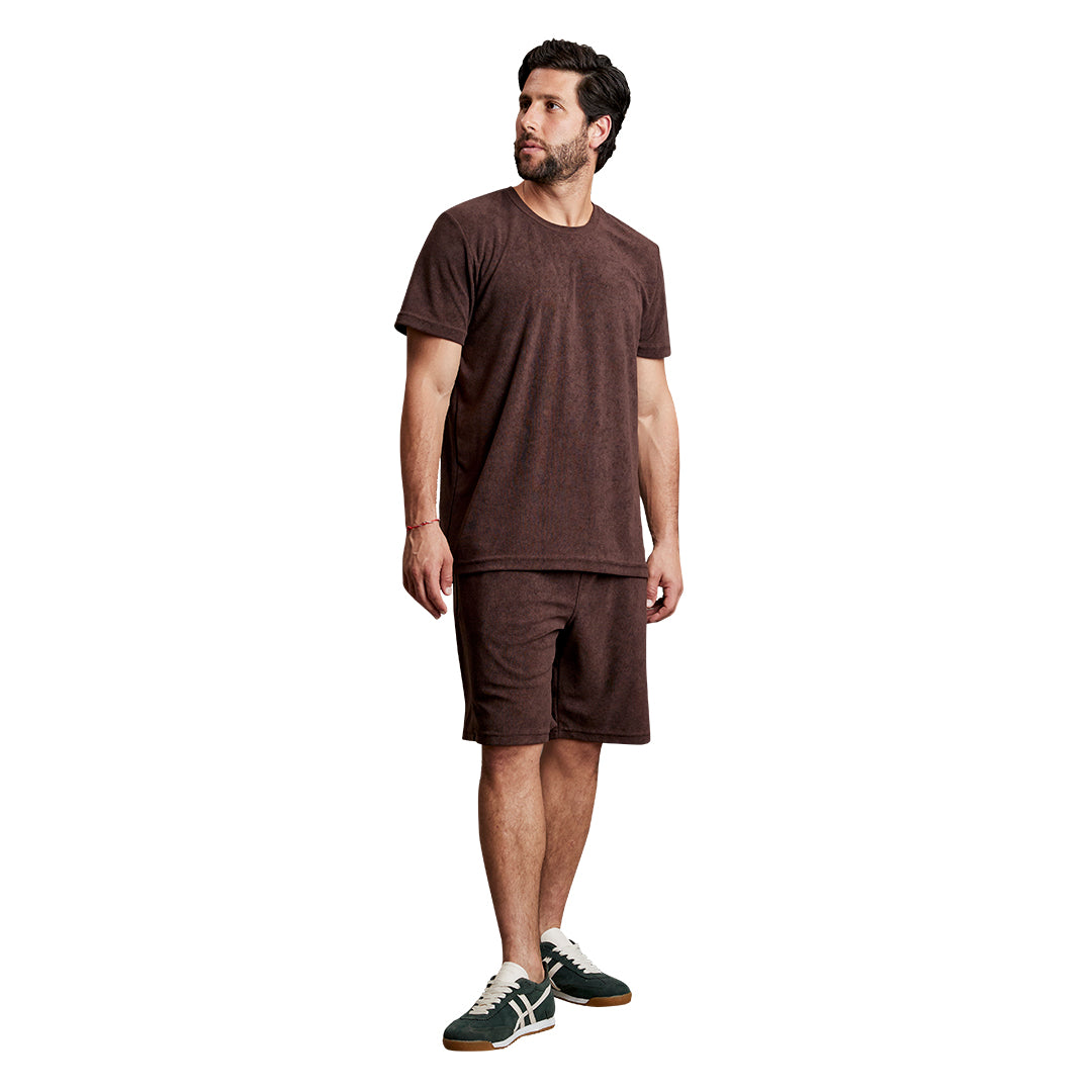 Playera color café con textura tipo toalla, cuello redondo y manga corta. Confeccionada en poliéster suave y ligero que brinda comodidad y frescura. Su diseño moderno y versátil la hace ideal para outfits casuales o de descanso con estilo relajado y contemporáneo.