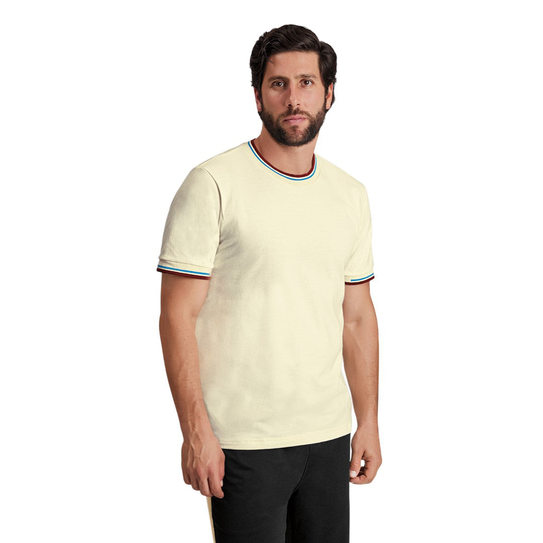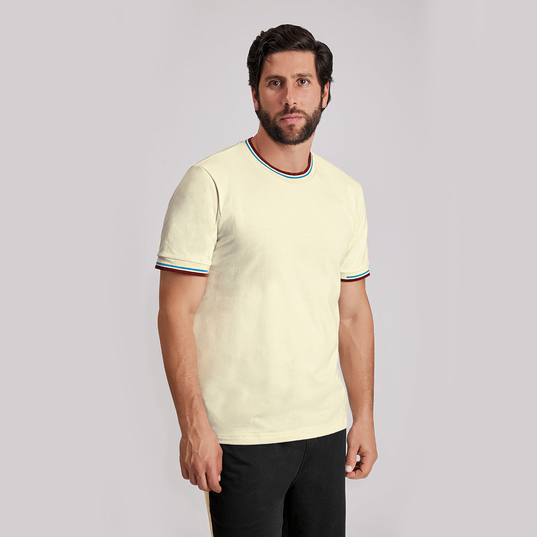 Playera color ivory de manga corta con cuello redondo y detalles en contraste tinto y azul que aportan un toque moderno y distintivo. Confeccionada en tejido suave y ligero que brinda comodidad durante todo el día. Ideal para un look casual y versátil con estilo contemporáneo.
