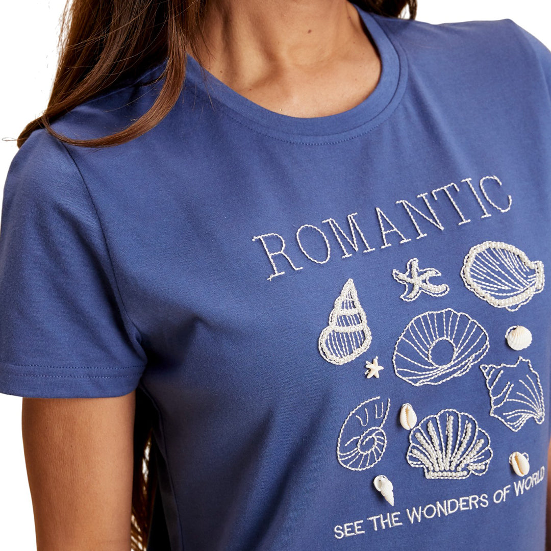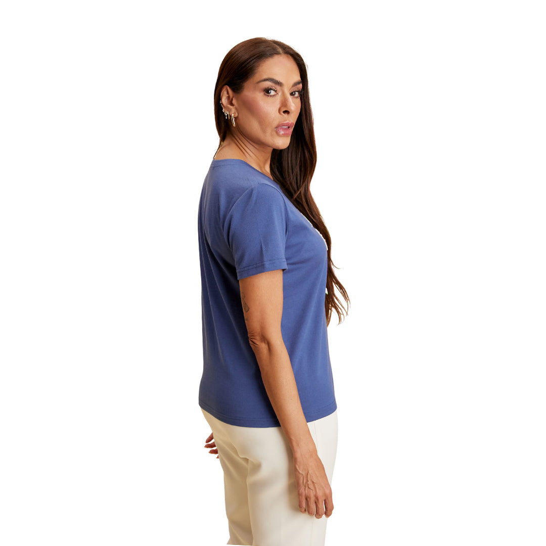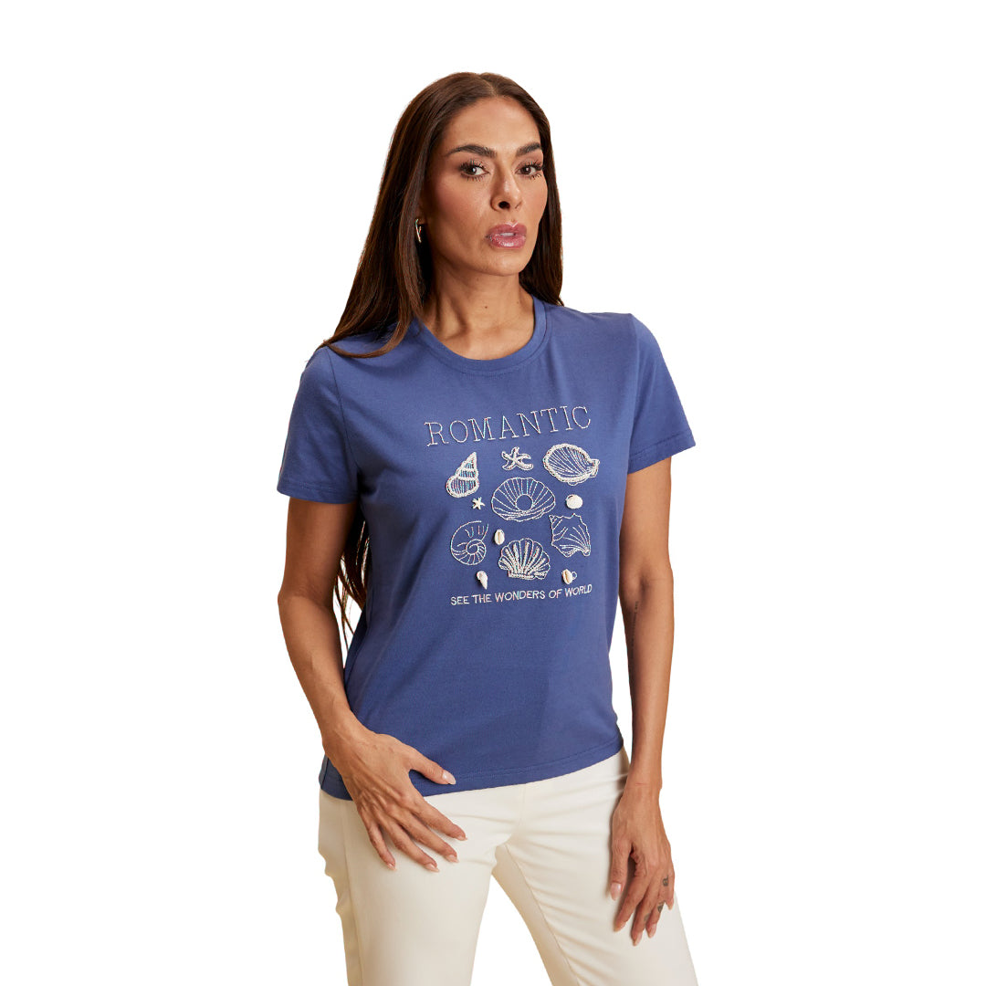 Playera color marino para mujer con cuello redondo terminado en cardigán y manga corta. Presenta bordado con aplicación de perlas y conchas que aportan un estilo sofisticado y distintivo. Su corte regular y mezcla de telas ofrecen comodidad y durabilidad.