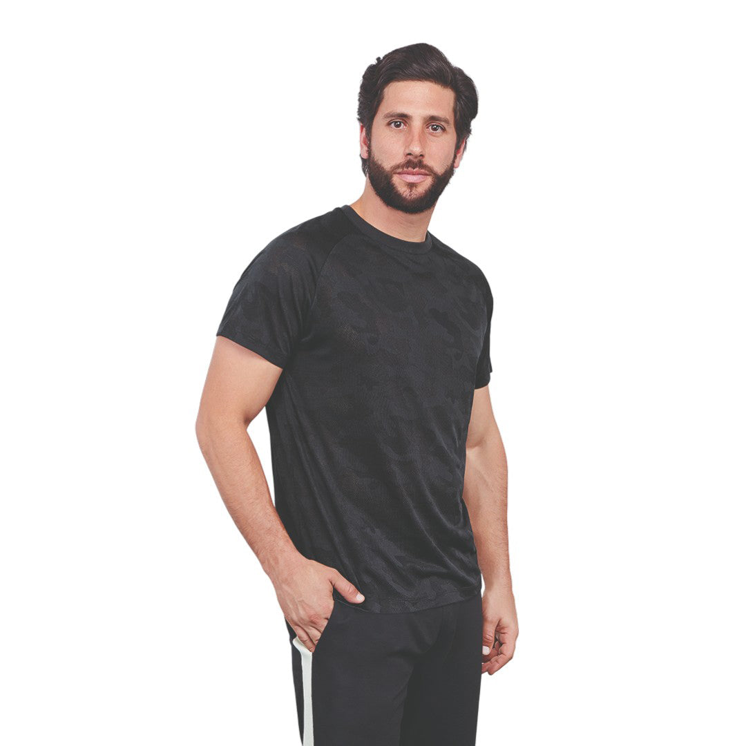 Playera negra SuperSport de manga corta con estampado militar, cuello redondo y tela ligera; diseño cómodo y moderno ideal para uso diario.