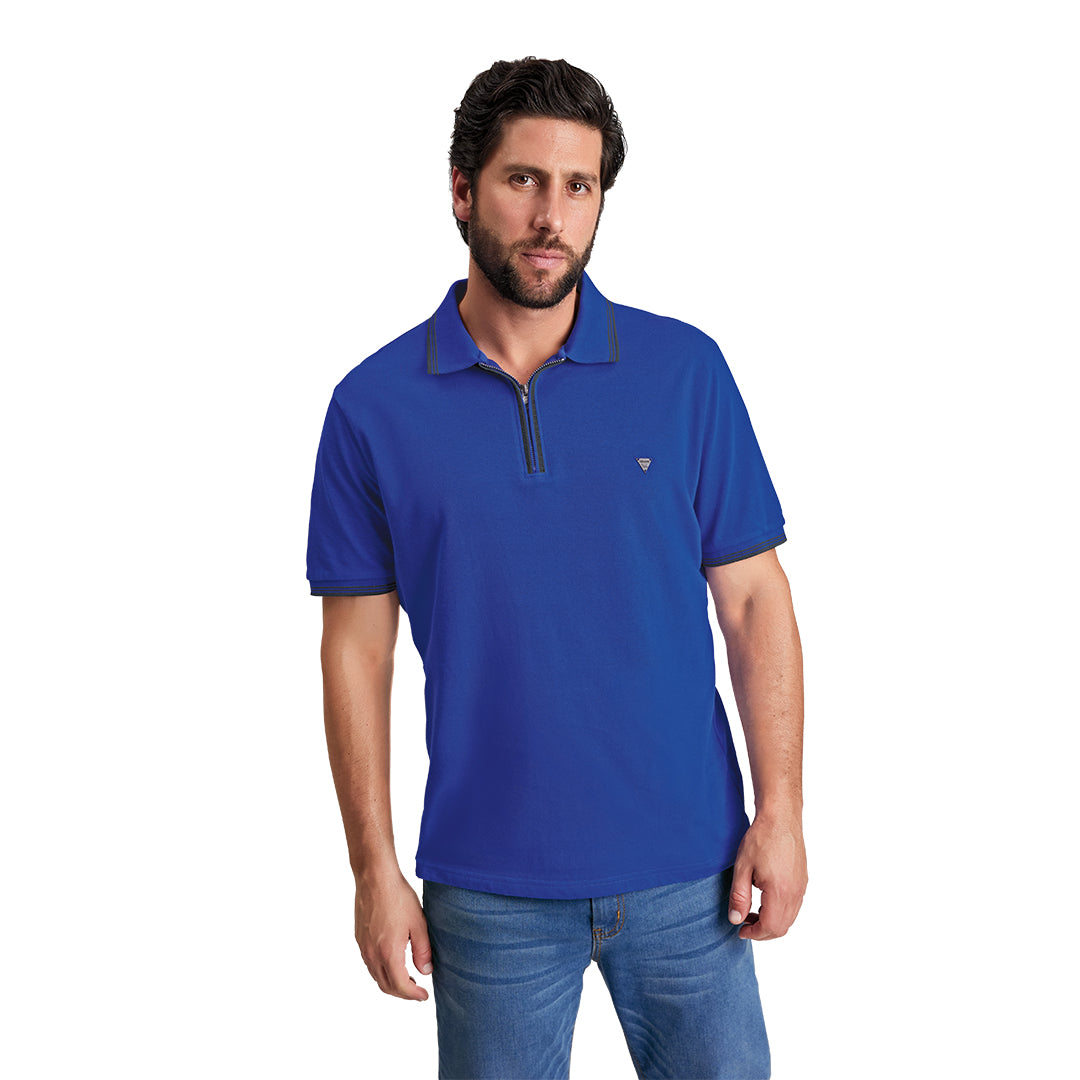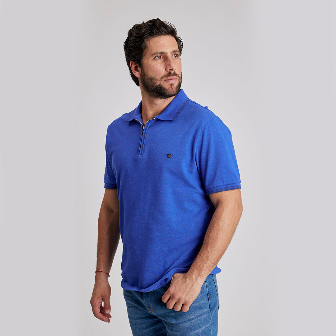 Playera tipo polo azul para hombre con manga corta y cierre zipper que aporta un toque moderno. Confeccionada en algodón, brinda suavidad, frescura y confort. Ideal para looks casuales o semi formales, perfecta para el día a día con estilo actual.