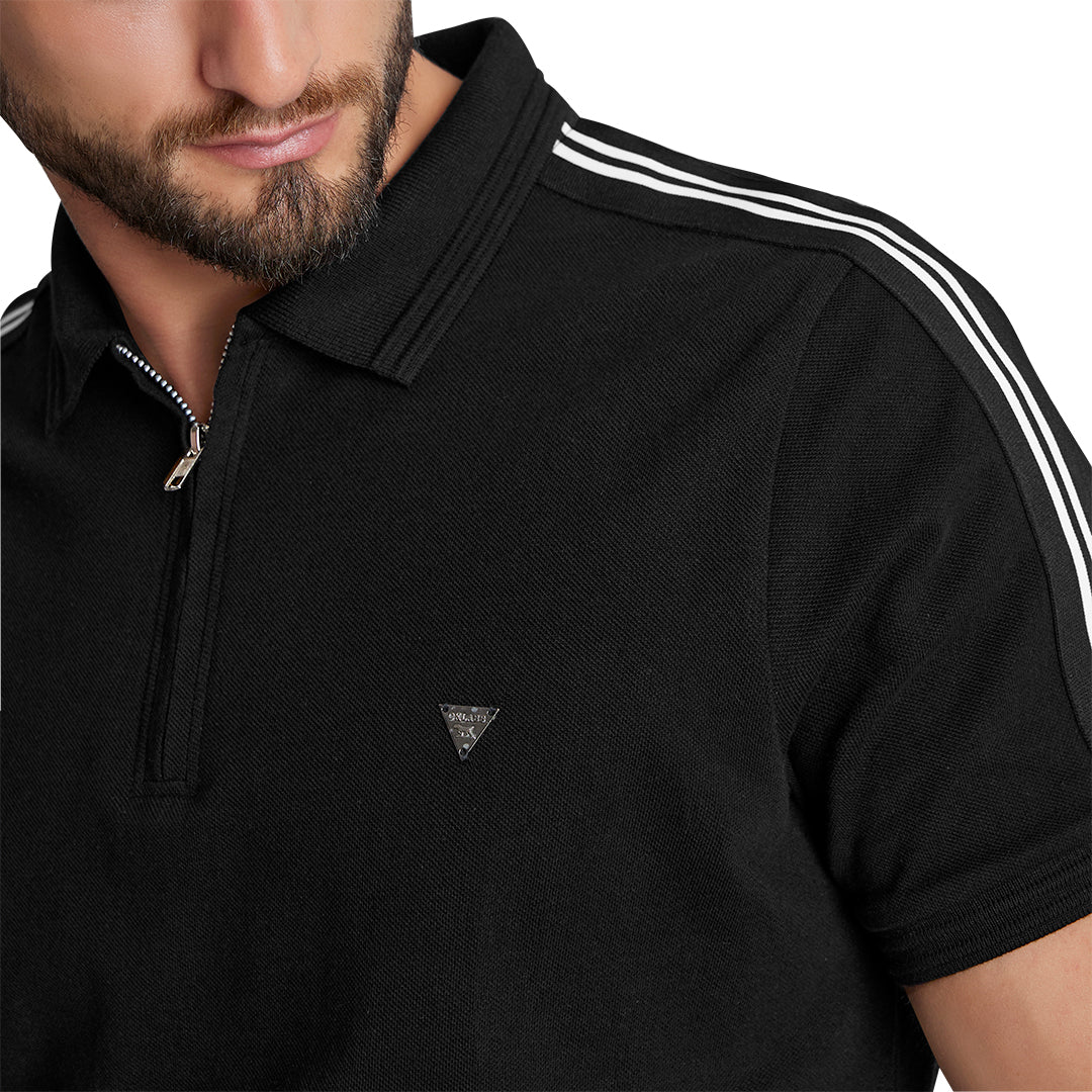 Playera tipo polo negra para hombre de manga corta, con contraste en mangas que aporta un toque moderno y sobrio. Confeccionada en algodón, brinda frescura y comodidad. Ideal para looks casuales versátiles y combinables para cualquier ocasión.