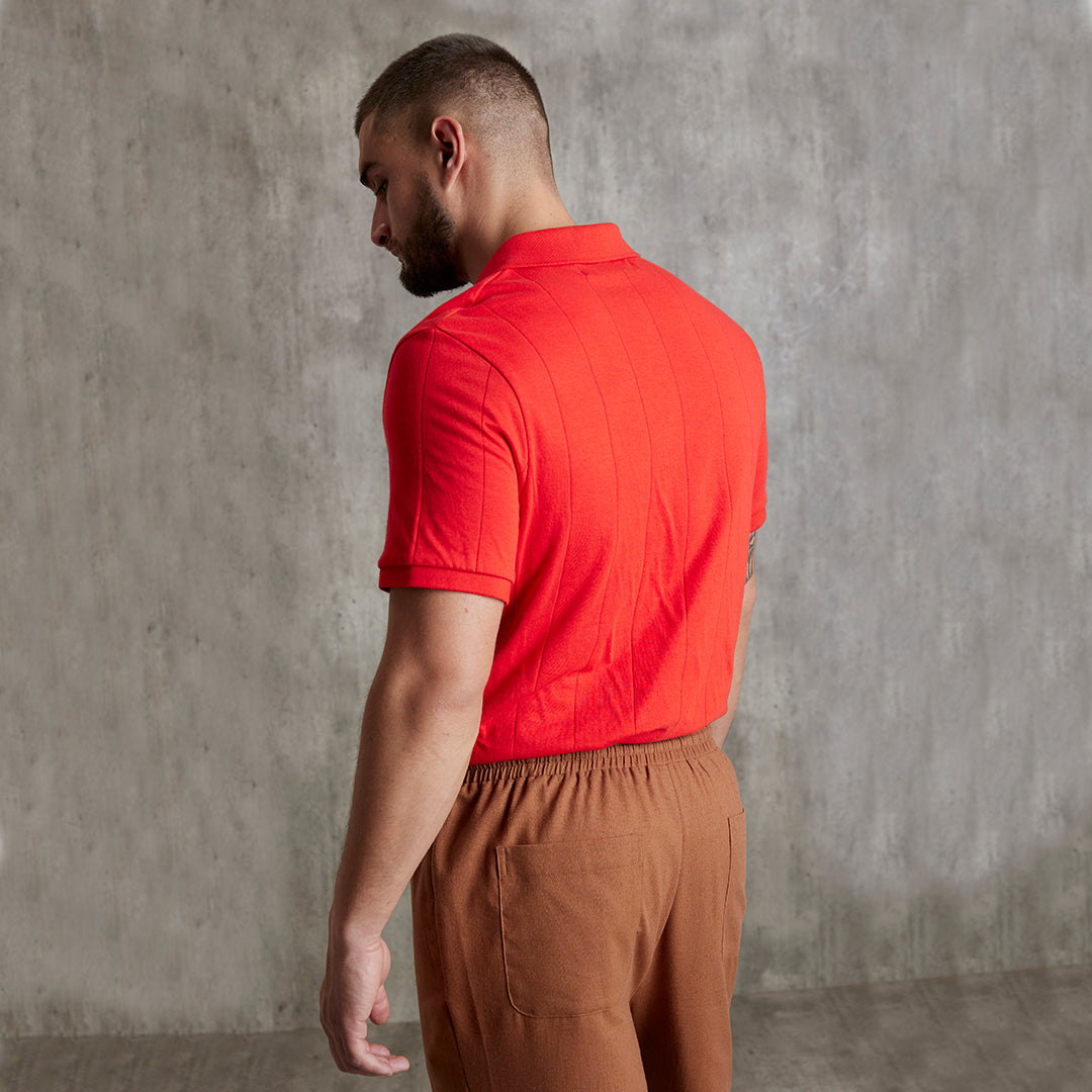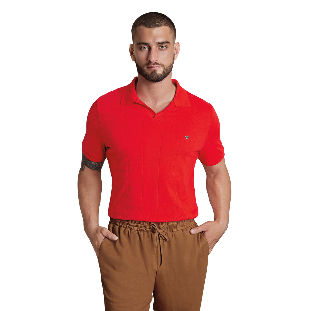 Playera tipo polo roja para hombre de manga corta, con diseño clásico y corte cómodo. Elaborada en algodón que aporta frescura y suavidad. Ideal para looks casuales con personalidad, perfecta para actividades diarias, reuniones informales o fines de semana.