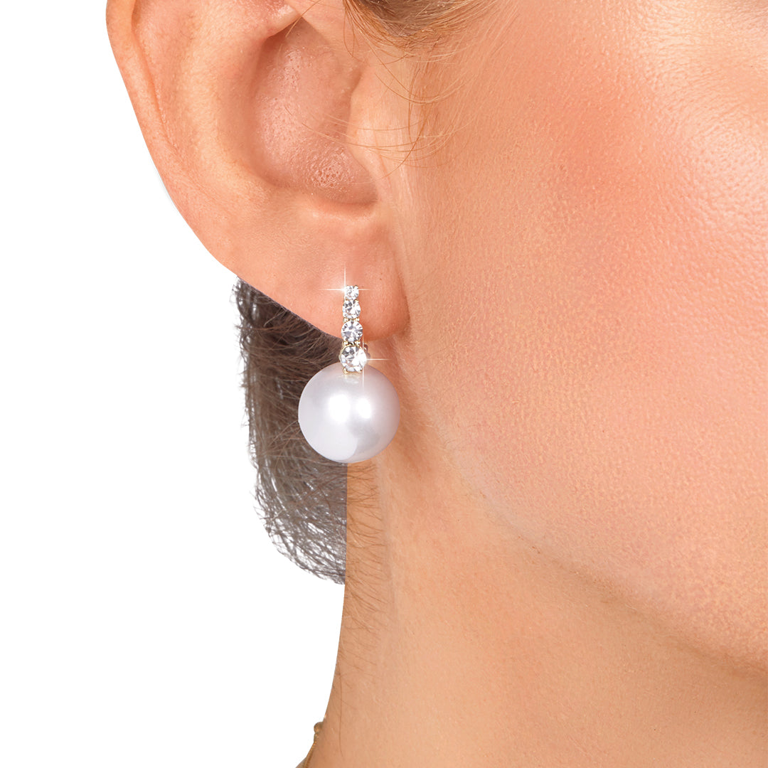 Aretes dorados con perla y pedrería tamaño mediano; combinación femenina y moderna ideal para looks elegantes.