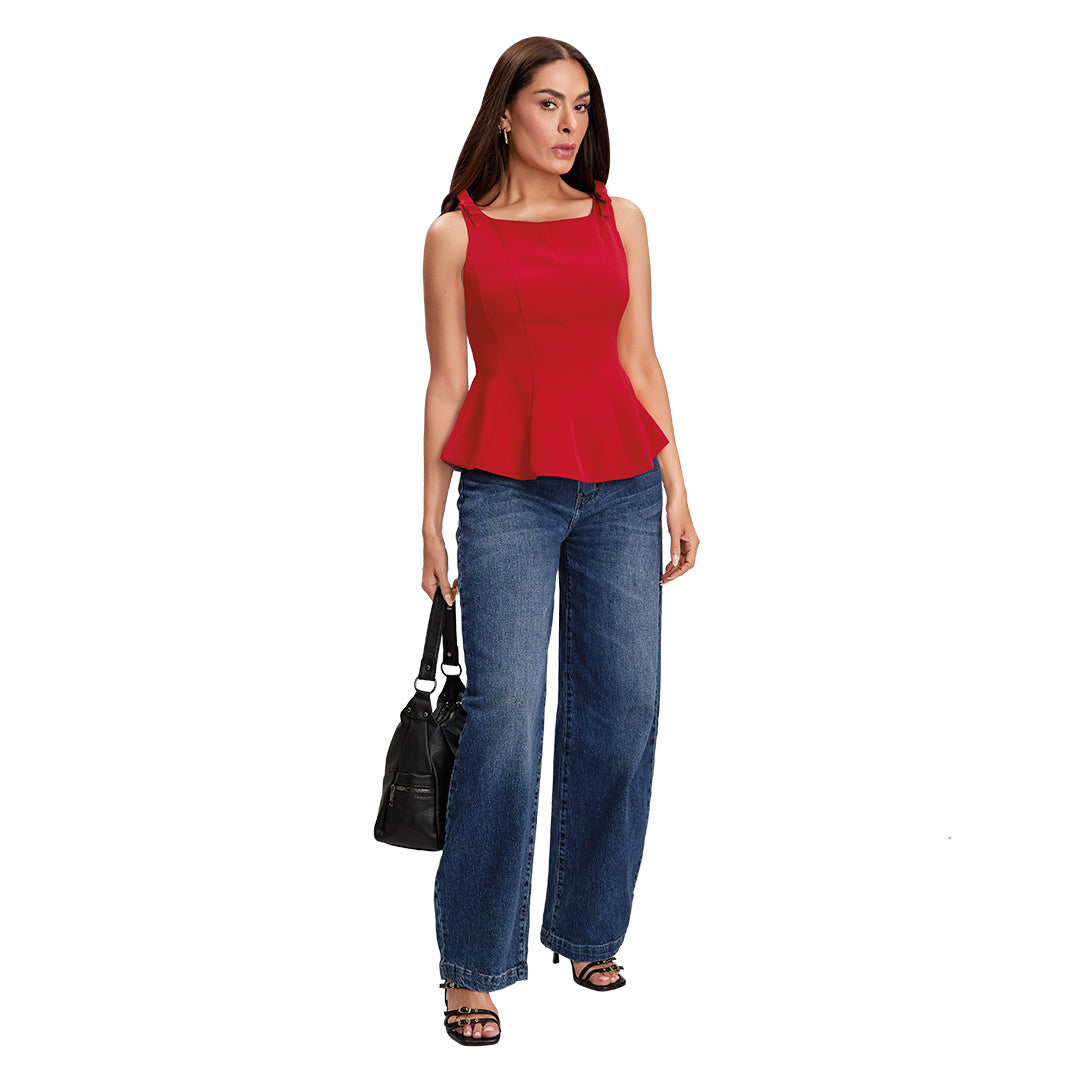 Blusa roja con escote ojal, moños decorativos en hombros y peplum acinturado para realzar la silueta. Cremallera invisible en costado. Elegante y femenina.