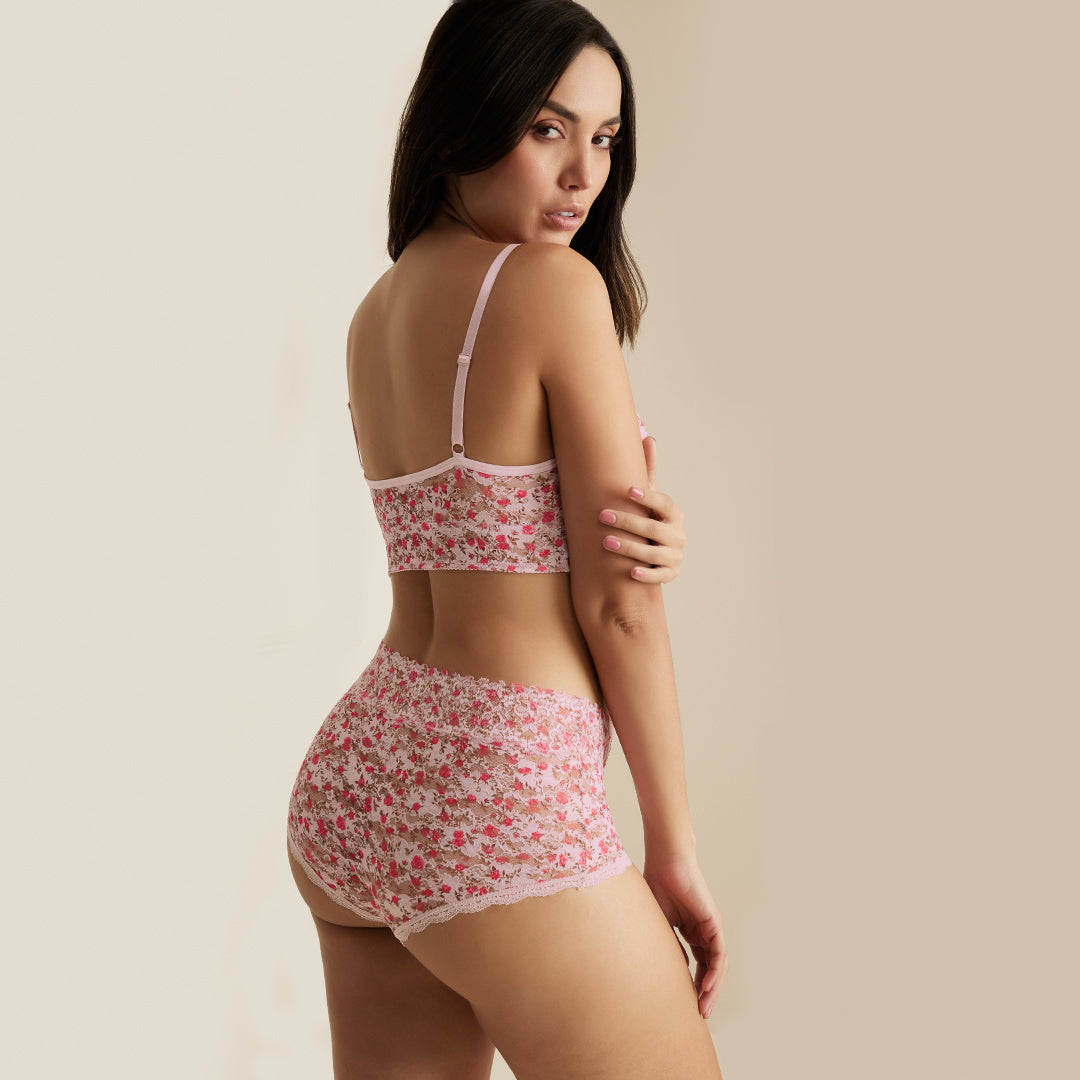 -Bóxer multicolor de encaje con pretina elástica, borde decorado y puente de algodón; femenino, suave y perfecto para uso diario.