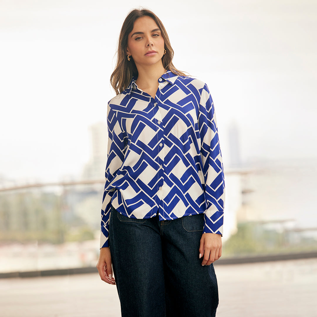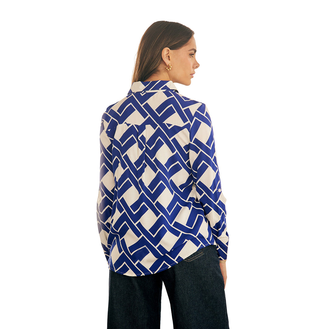 Camisa multicolor con figuras geométricas en azul e ivory, cuello camisero y manga larga con puño. Corte holgado con caída fluida ideal para oficina o looks casuales elegantes.
