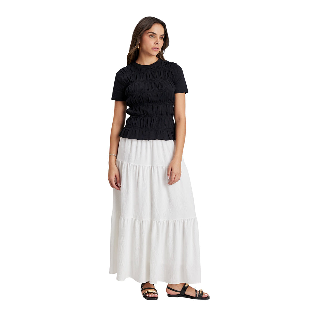Falda ivory midi para dama con cintura elástica y dos cortes en pastelones que aportan movimiento y fluidez. Confeccionada en tela texturizada con forro interno para mayor comodidad. Ideal para looks elegantes, casuales o de oficina gracias a su caída suave y estilo femenino moderno.